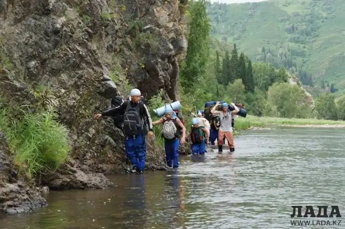 В лесу у реки команда разбивает лагерь и водружает флаг Казахстана. В 2014 году это уже 17-ая поездка в монастырь. Не юбилейная, но весьма значимая для всех участников похода.