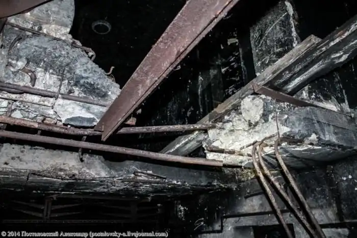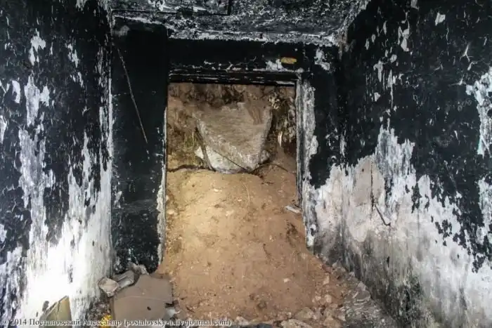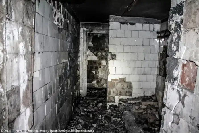 Часть несущей конструкции верхнего этажа шахты обвалилась. Судя по всему, был взрыв баллона, хотя не уверен. Но стены здесь закопчены.