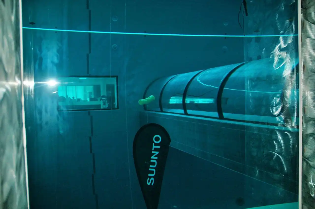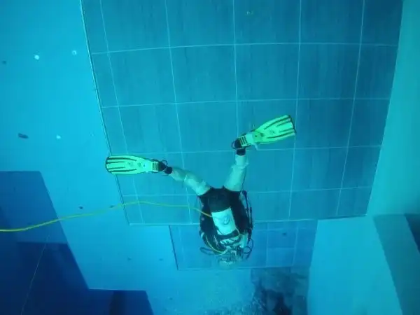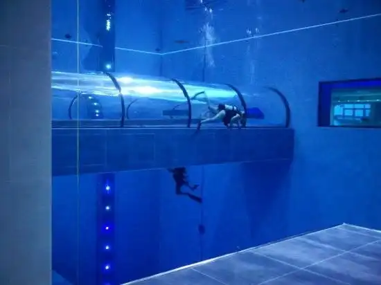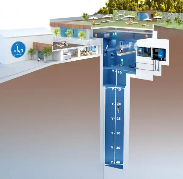 Если вы сможете задержать дыхание на время, которое вам потребуется для того, чтобы добраться до дна в этом бассейне, значит, вы принадлежите к тем немногим, кому это удалось. Потому что это — Y-40 The Deep Joy, который благодаря своей ошеломляющей глубине в 40 м считается самым глубоким бассейном в мире. Этот невероятный плавательный центр, построенный по проекту известного архитектора Эмануэле Боаретто находится в четырёхзвёздочном отеле Terme Millepini в Италии. Бассейн этот высотой с 12-этажное здание. Примерно такая же высота получится, если взять девять двухэтажных автобусов, и поставить их друг на друга.