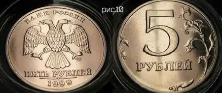 Легендарная пятирублевка имеет следующие отличительные признаки: скругленный верхний левый угол цифры «5», ее гаста справа имеет острые углы, заостренные ступеньки в нижней части букв слова «РУБЛЕЙ», лист растения касается канта, точка малая, маленький овальный знак монетного двора (рис.10).