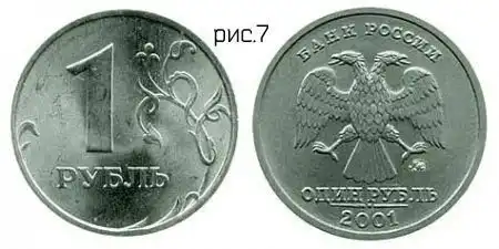 В Российской Федерации чеканилось несколько разновидностей монет 2001 года номиналом в один рубль. Хотя официально она в обиход не выпускалась, но все же какое-то количество этих денежных средств в обращение попало, сколько именно штук – неизвестно. Эту монету можно назвать одной из самых редких и дорогих монет современной России. Для монеты 1 рубль 2001 года стоимость может доходить до 30 тыс. рублей, в зависимости от состояния (рис.7).