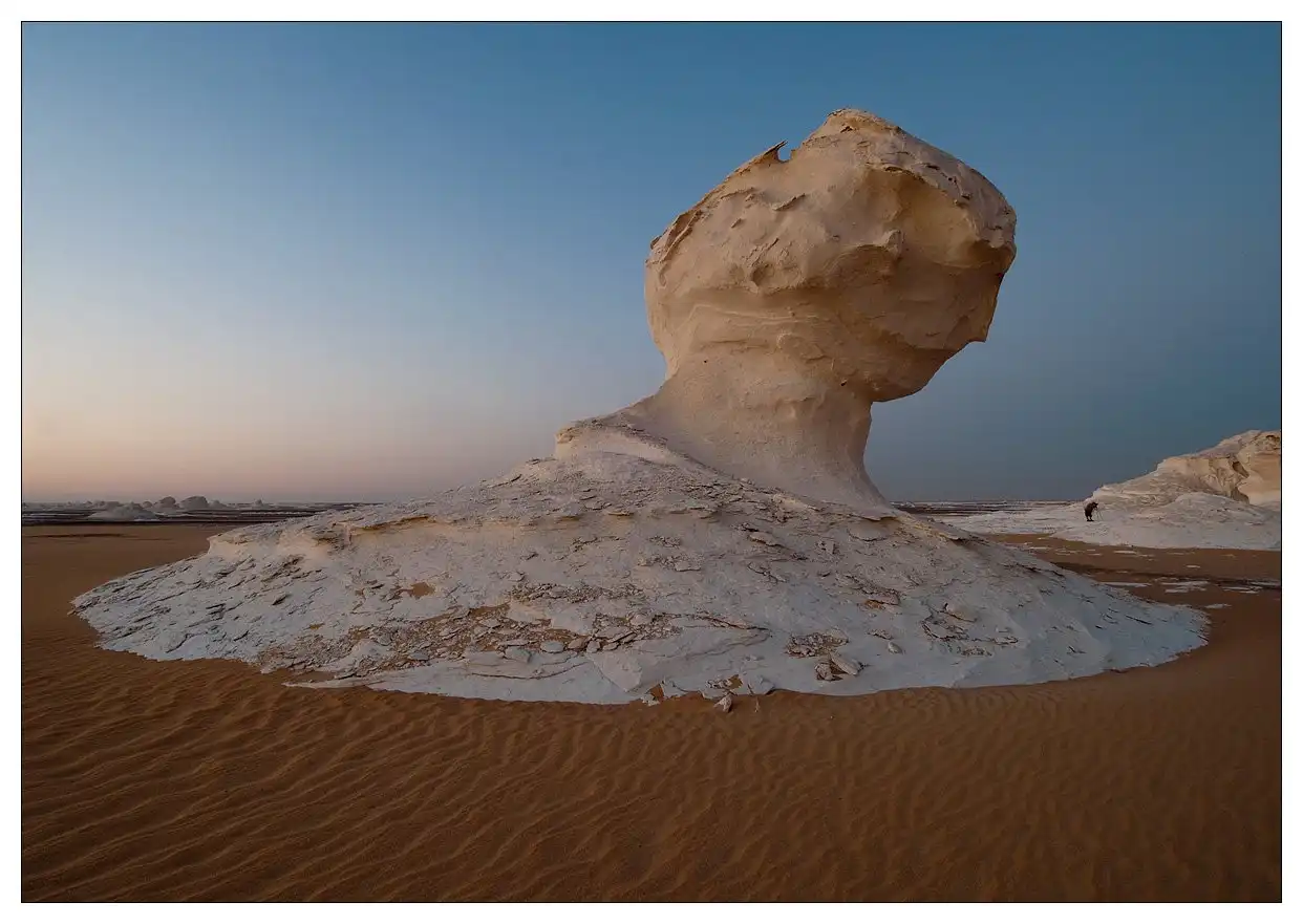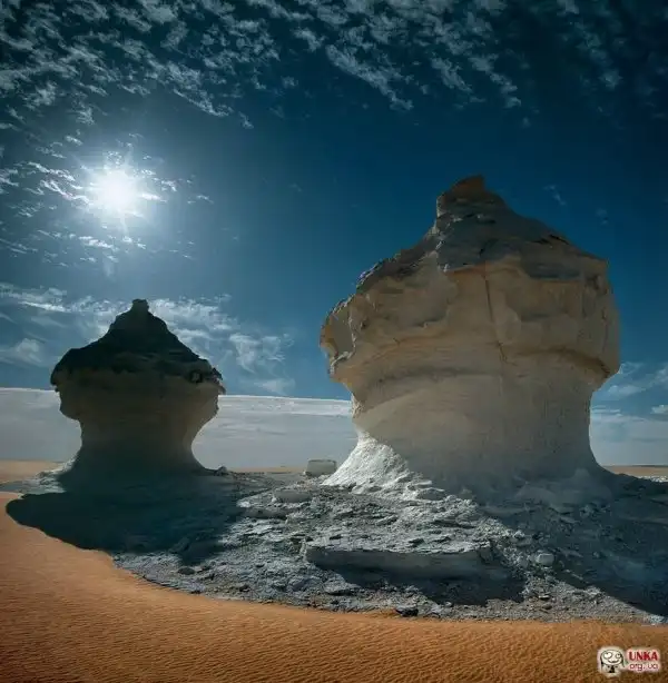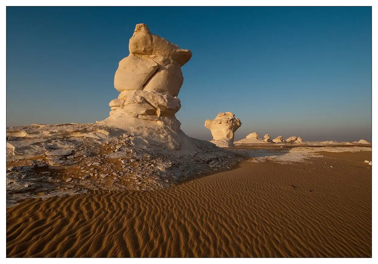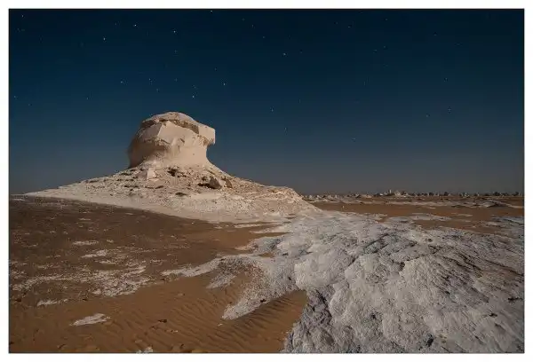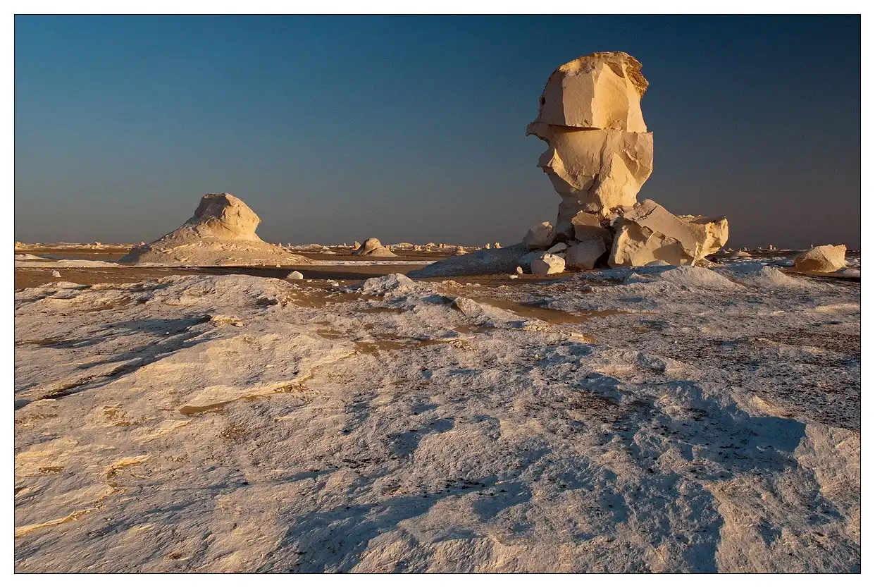 Бе́лая пусты́ня в Египте— небольшой участок на востоке пустыни Сахара площадью примерно 300 км2. (10 км x30 км), лежащий по дороге между оазисами Бахария и Фарафра. Расстояние от Каира до Белой пустыни 500 км.; Белая пустыня известна причудливыми карстовыми* образованиями. Много миллионов лет назад здесь было дно океана, и белая порода — это останки морских микроорганизмов. За века ветер и пески превратили бывшее дно моря в подобие поверхности какой-то другой планеты. Пустыня имеет бело-кремовый оттенок — массивная меловая порода образовалась в результате периодических песчаных бурь в районе.