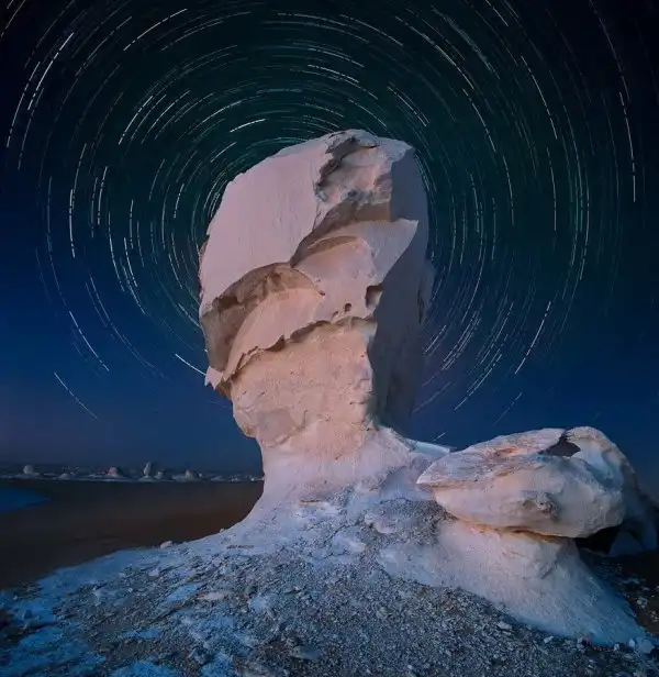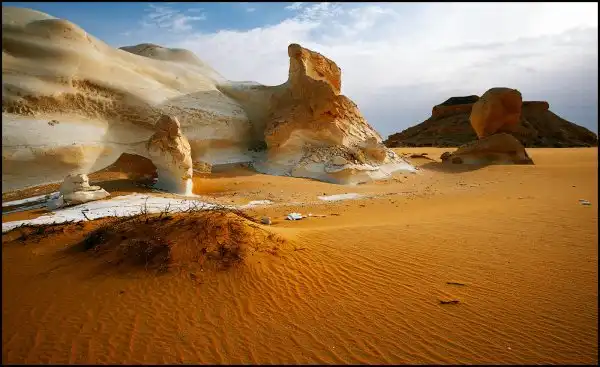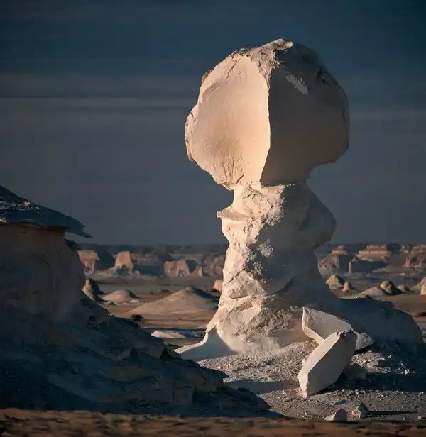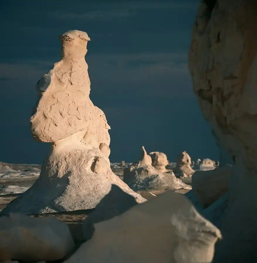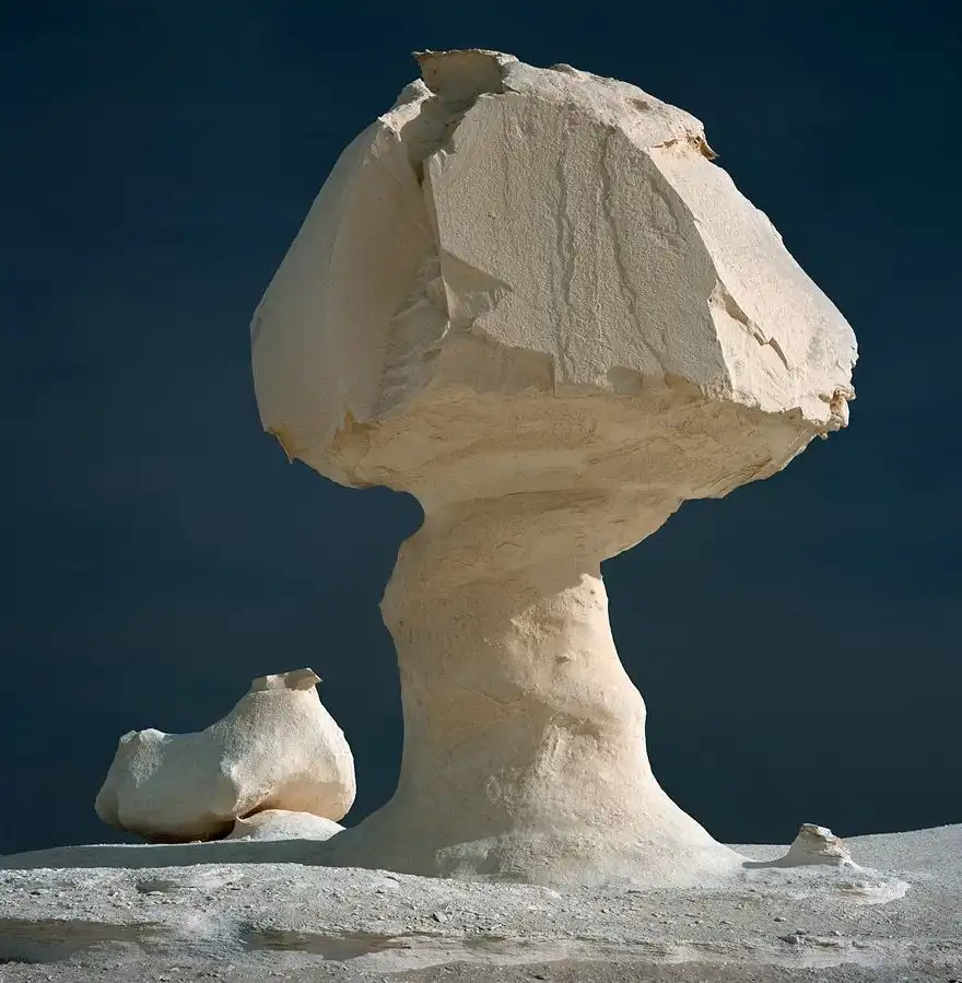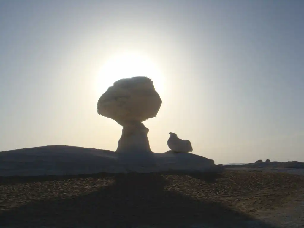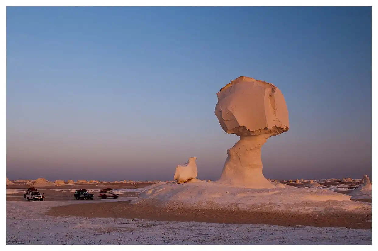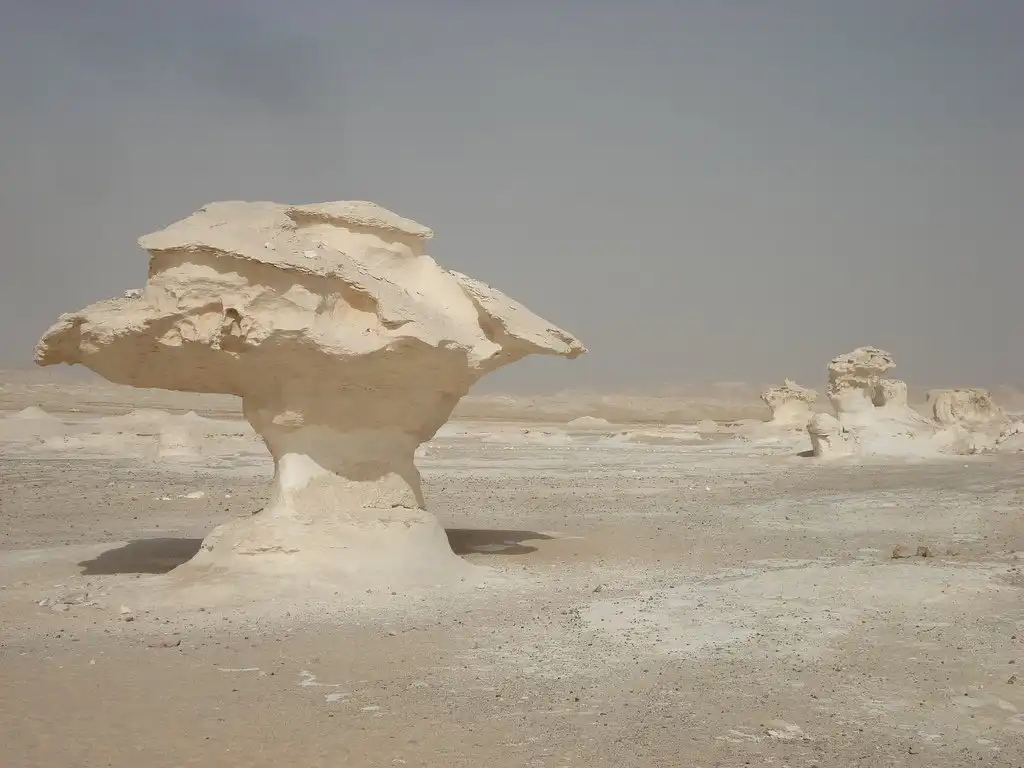 Самое интересная достопримечательность – белая скала, балансирующая на белом столбе. Белоснежная пустыня фактически сделана из мела, формировавшего образования на протяжение тысячелетий. Каменные грибы в пустыне когда-то были обычными горными формированиями, но с течением времени их основания были стерты ветром и песком, который дует здесь с довольно большой скоростью. Вот и стоят эти каменные монументы, вопреки всем законам тяжести. Кажется, что они могут обрушиться в любой момент, но этого не происходит. Монументы здесь разной формы – это купола, замки, башни, минареты.