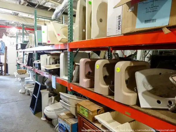 Сегодня предлагаю вам посетить один из самых необычных строительных магазинов, в своей жизни. Я даже не очень понимаю, как его правильно назвать. Там продают то, что остается полезного при сносе старого дома, или то, что остается ненужного после ремонта в квартире. Там много старой мебели, но это не антикварная лавка. Там много строительных материалов, но это не магазин для ремонта. Чтобы понять что это такое, представьте себе большой супермаркет, типа ОБИ, где есть все, начиная от сантехники и заканчивая досками. А теперь представьте, что все это старое и уже когда-то и кем-то использовалось в строительстве, после был демонтировано, почищено и теперь продается заново. Точно также лежит на полках с наклеенными ценниками. Масштабами этот бруклинский магазин до настоящего супермаркета конечно не дотягивает, но тем не менее ассортимент и разнообразие продающихся там товаров реально впечатляют.