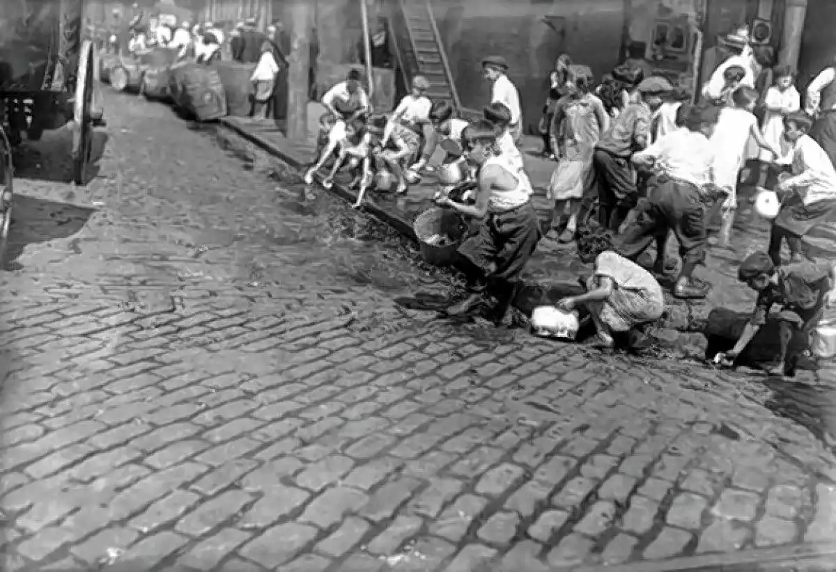 Дети собирают текущее по улице вино, которое было вылито агентами