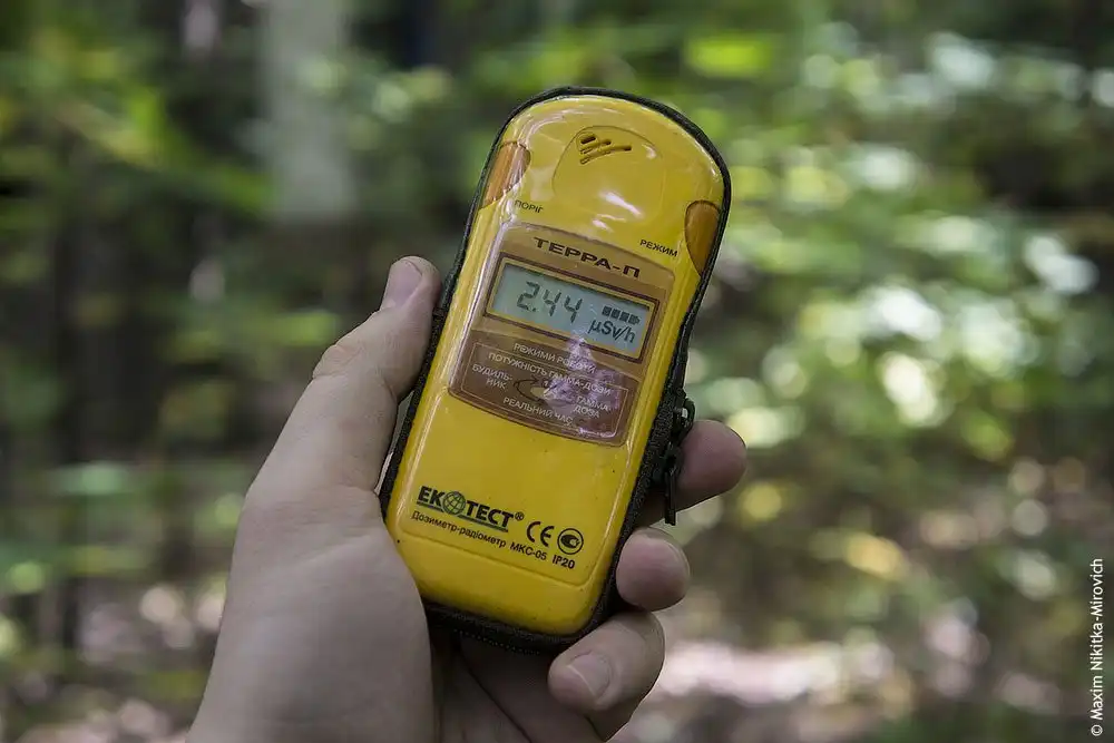 В лесочке около садика радиоактивный фон достигает примерно 250 микрорентген в час. Это относительно немного, но вглубь леса заходить не стоит — даже закопанные в землю, остатки старых домов "светят" весьма прилично.