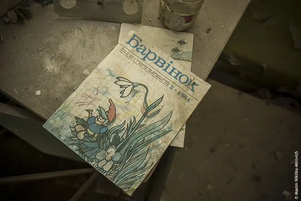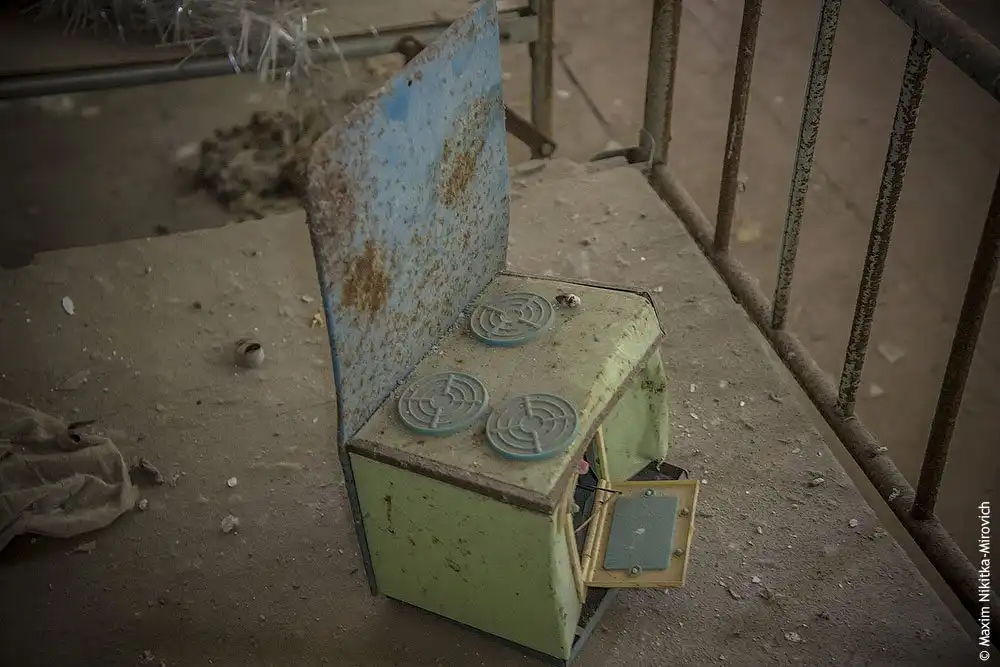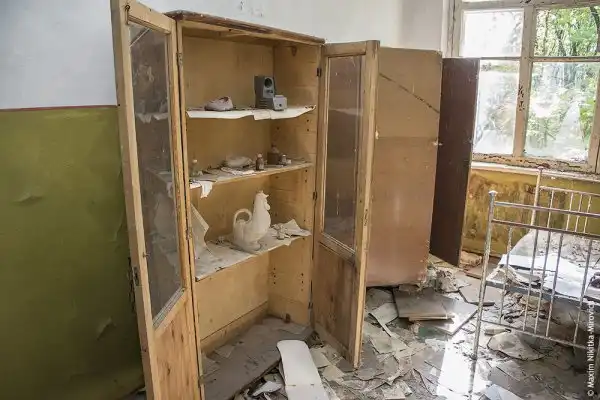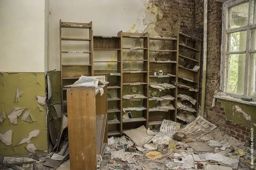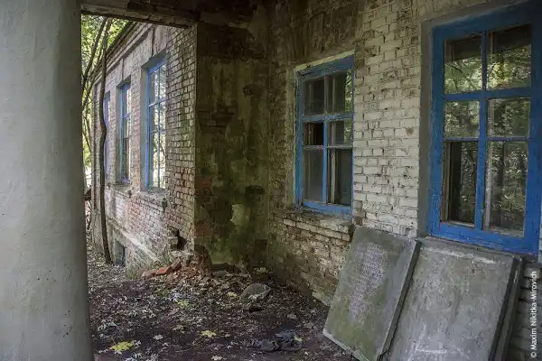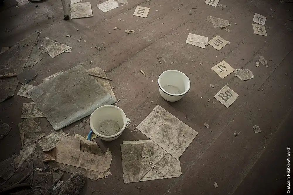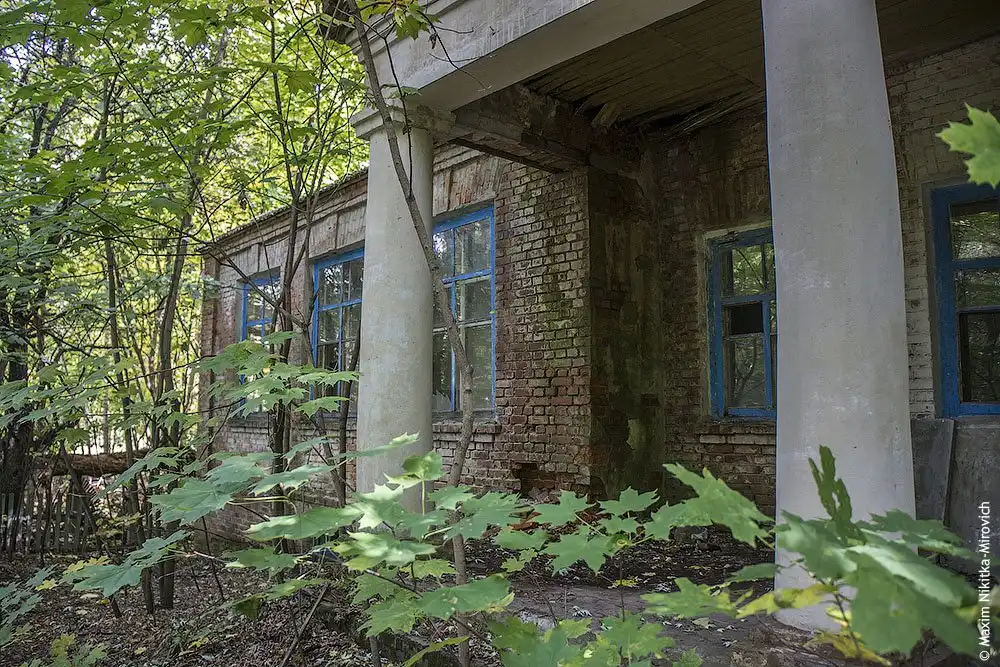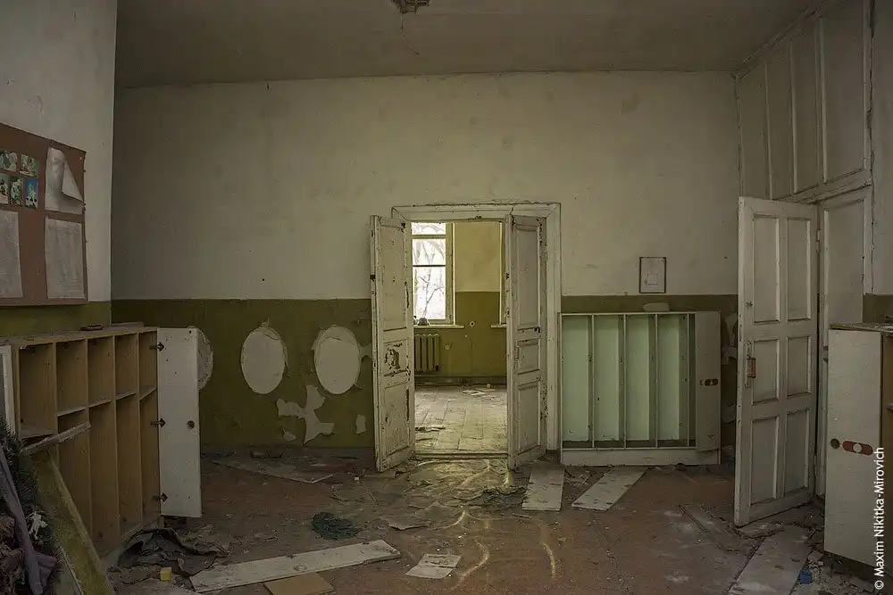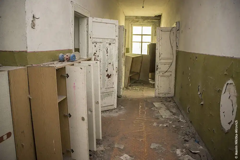 Для меня стал загадкой тот факт, почему в уничтоженном поселке уцелел детский сад. Думаю, были какие-то планы сделать здесь что-то вроде штаба ликвидации последствий аварии, перевалочного пункта дозиметристов или чего-то подобного, но им не было суждено осуществиться. По интерьерам здания очень хорошо видно, что после эвакуации села оно не ипользовалось уже никак и никогда.