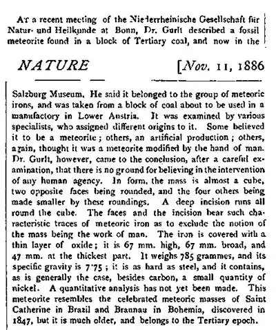 "На недавнем собрании Niederrheinishe Gesellshaft fur Natur- und Heilkunde [Нижнерейнского Общества любителей естественной истории и медицины] в Бонне д-р Гурльт описал ископаемый метеорит, найденный в куске угля третичного периода. Нынче он находится в Зальцбургском музее. По его словам, метеорит относится к числу железных, и был извлечен из куска угля, который собирались использовать на фабрике в Нижней Австрии. Предмет был изучен разными специалистами, высказавшими различные мнения о его происхождении. Некоторые считают его метеоритом, другие — рукотворным предметом, а третьи — метеоритом, но обработанным руками человека. Д-р Гурльт, однако, после тщательного изучения пришел к выводу, что нет никаких оснований предполагать вмешательство человека. Он по форме почти кубический, две его противоположные стороны закруглены, а четыре другие стороны стали меньше из-за закруглений. Вокруг всего куба проходит глубокая борозда. Как стороны, так и борозда имеют весьма характерные для метеорного железа следы, исключающие версию о том, что предмет был творением рук человеческих. Железо покрыто тонким слоем ржавчины, его размеры — 67 мм в высоту, 67 мм в ширину и 47 мм в самой толстой его части. Весит предмет 785 грамм при удельном весе 7,75; он твердый как сталь и содержит, как обычно в подобных случаях, кроме углерода, небольшое количество никеля. Количественный анализ пока не проводился. Метеорит напоминает известные метеорные тела из Сент-Катарины в Бразилии и Браунау в Богемии, найденные в 1847 году, но гораздо старше, так как принадлежит к третичному периоду".