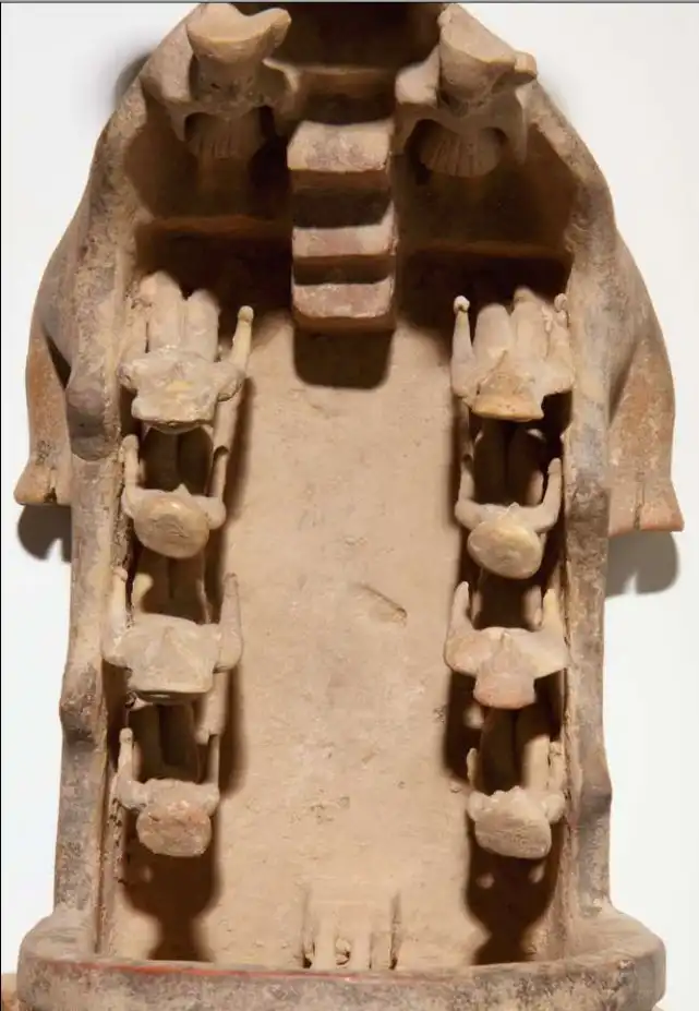 На «лодке» присутствует 15 человеческих фигур, которые образуют нечто, что можно описать словом «процессия». На этих фигурах есть следы чёрной, красной и жёлтой краски. Некоторые фигурки в «процессии» имеют на голове одни и те же украшения, и они носят конические «мантии», которых не наблюдается на других подобных статуэтках. Также можно увидеть женскую фигуру, которая сидит на «зубчатом троне», откуда и пошло название артефакта.