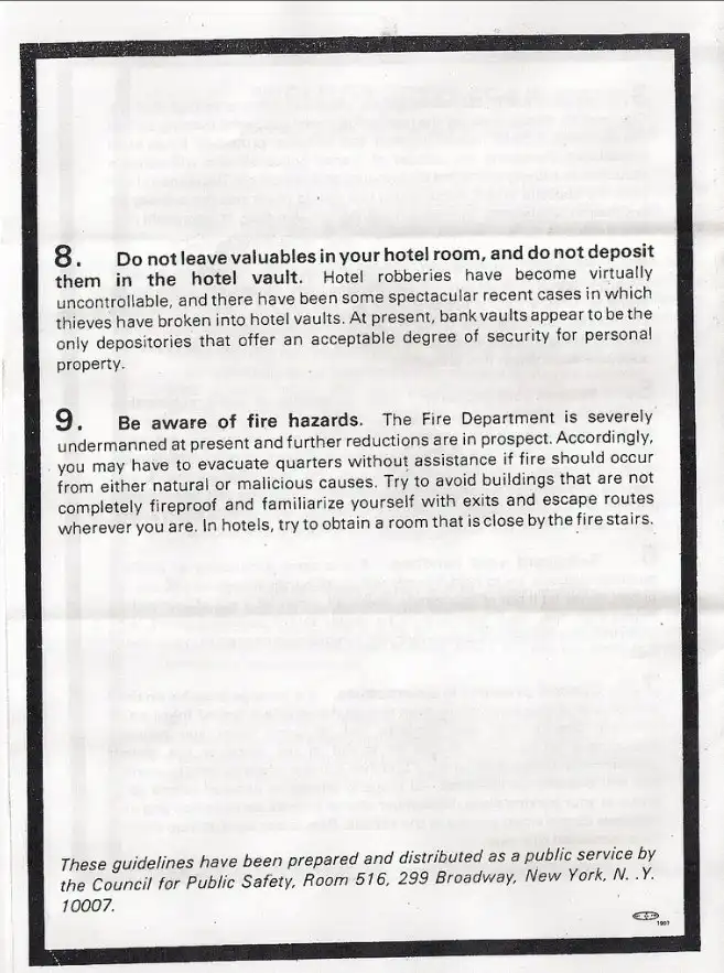 Брошюра была выпущена на деньги городских профсоюзов (полицейского, пожарного и пр.) в 1975 году и была ответом на ситуацию в Нью-Йорке и большое сокращение работников оперативных служб. Это был самый настоящий шантаж городских властей и попытка привлечь максимальное внимание к проблемам города. Власти были так сильно возмущены содержанием брошюры, что попытались запретить ее распространение через суд. Однако профсоюзы суд выиграли и начали раздавать брошюру на вокзалах, в аэропортах и торговых центрах города. При этом нельзя сказать, чтобы они в ней что-то уж сильно наврали. Черепушка на обложке конечно зря, а так ситуация сложившаяся в Нью-Йорке на самом деле была уже за гранью. Город уверенно приближался к своему банкротству и в агонии пытался затыкать бюджетные дыры при помощи массовых сокращений городских служащих и урезании всех городских программ. Все это еще больше усугубляло ситуацию на его улицах. И если для жителей города многие вещи уже стали привычными, то непуганых туристов и приезжих стоило предупредить.