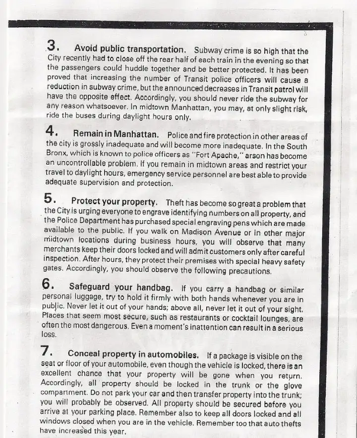 Брошюра под названием "Добро пожаловать в город страха. Руководство по выживанию для гостей Нью-Йорка." Исторический артефакт замечательно характеризующий обстановку в Нью-Йорке средины 70-х.