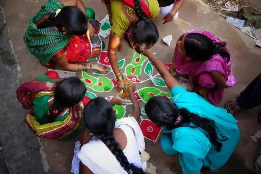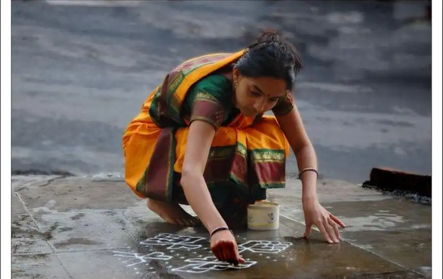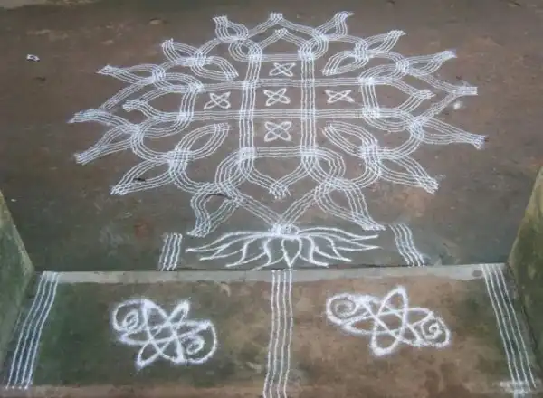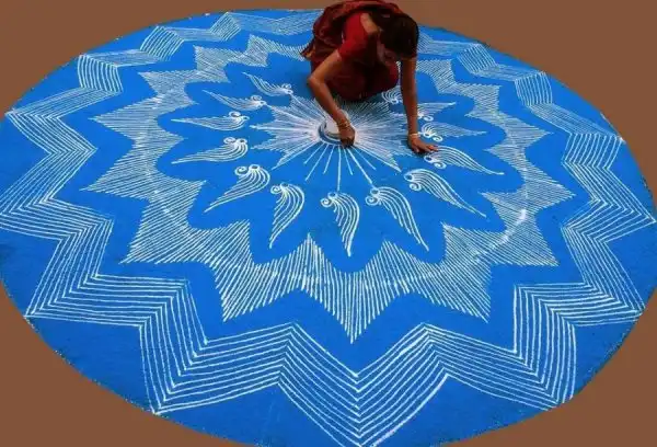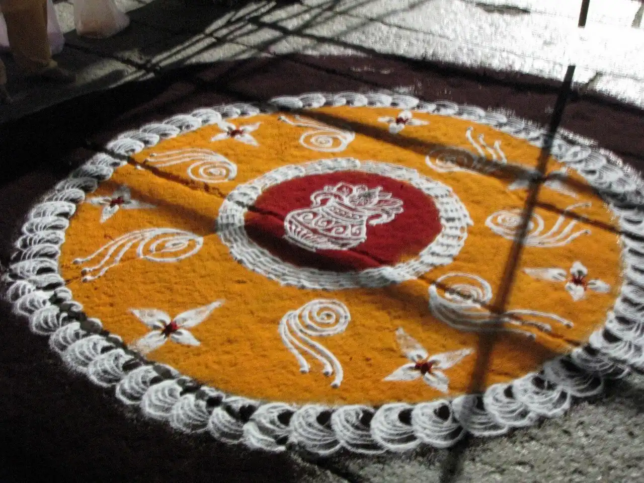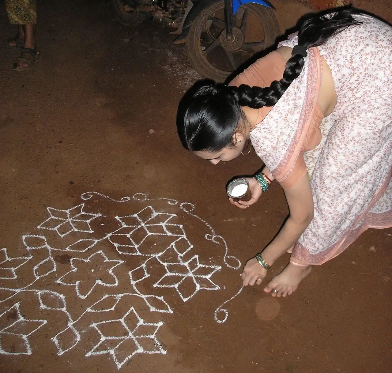 В Индии издревна существует много ритуалов, призванных принести в дом мир и гармонию. Одним из таких ритуалов, служащим для отпугивания злых духов, является рисование ранголи на полу возле главного входа в дом.