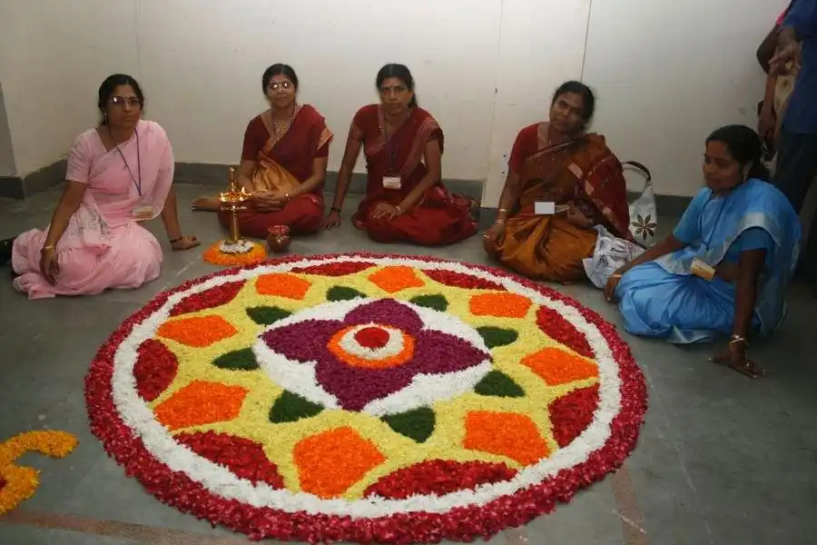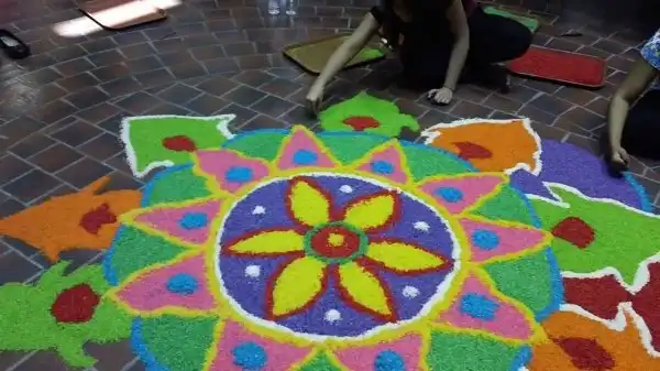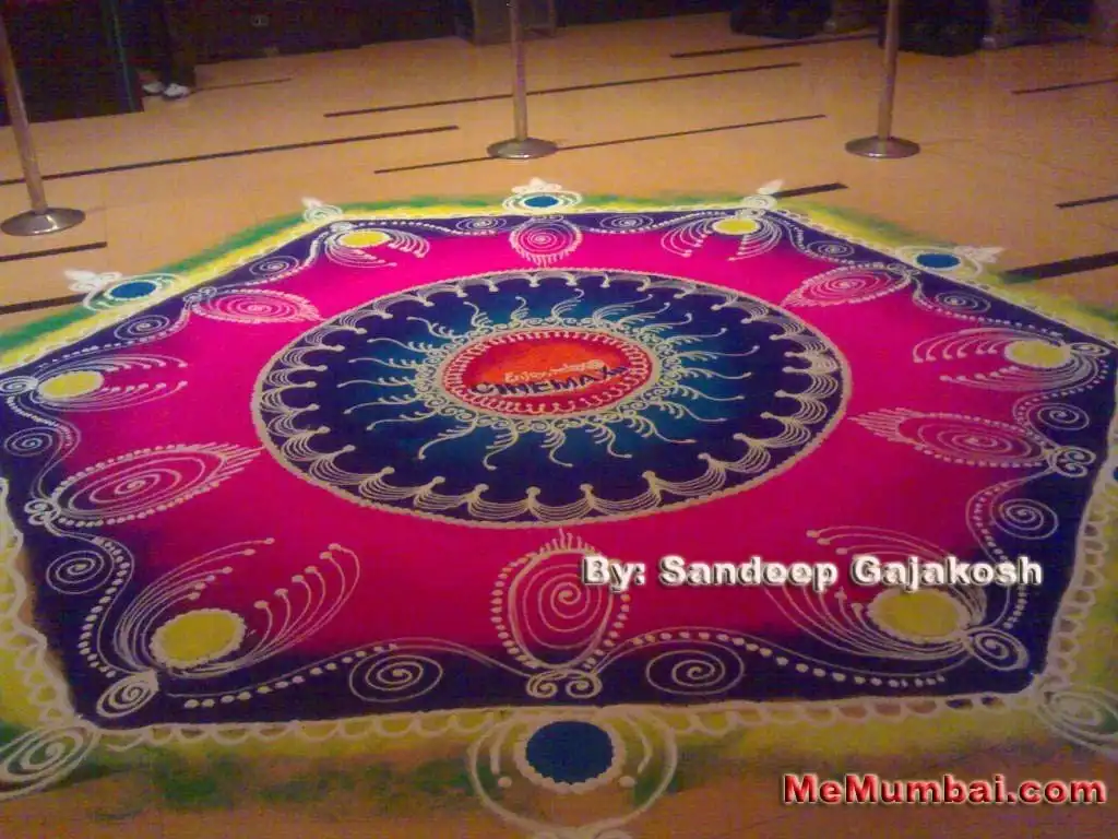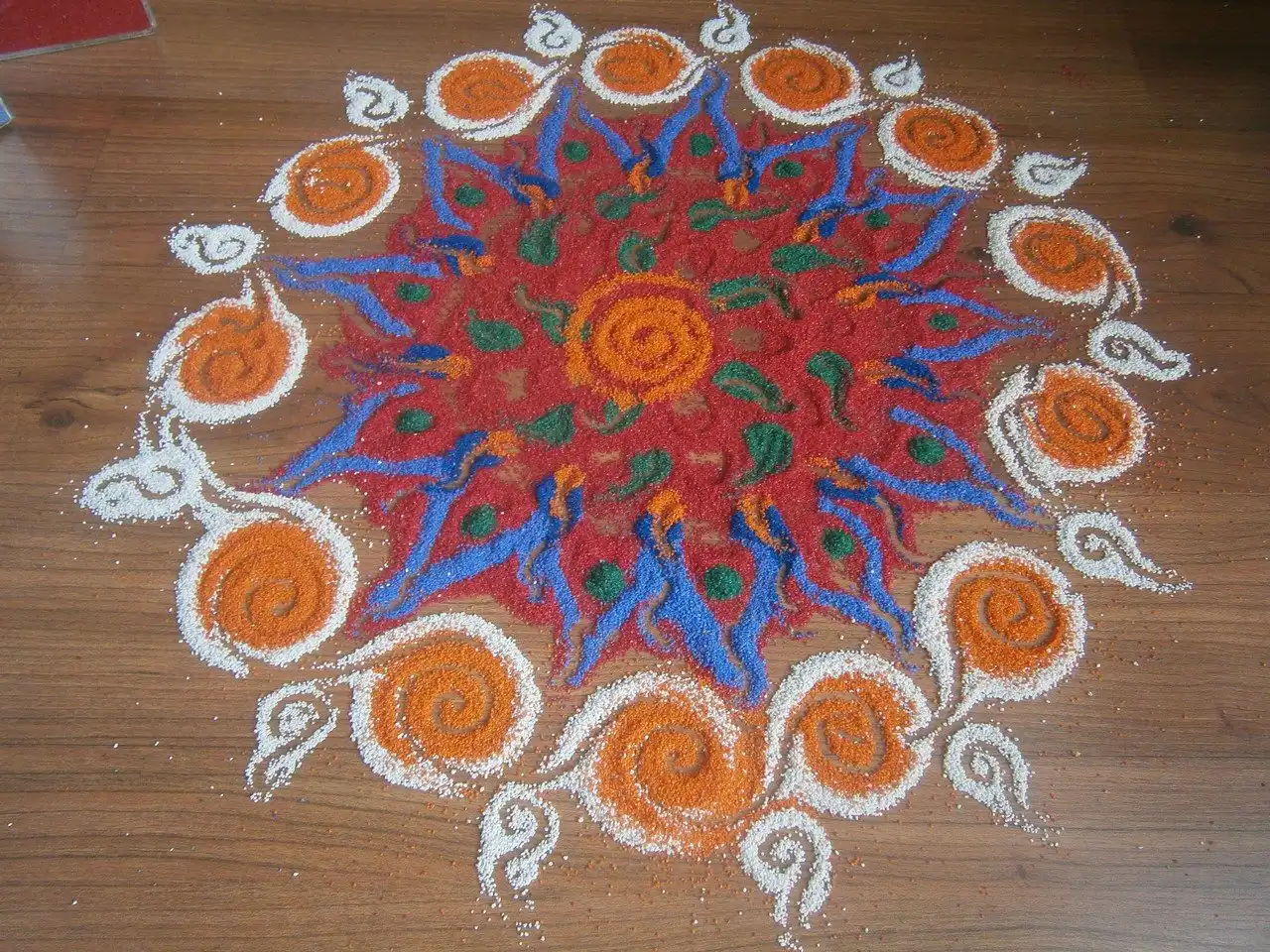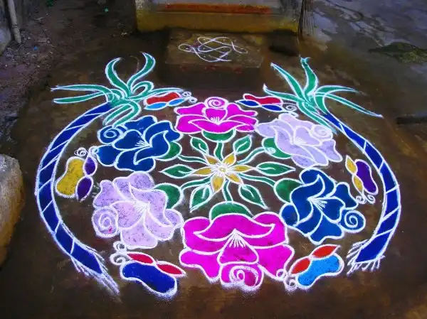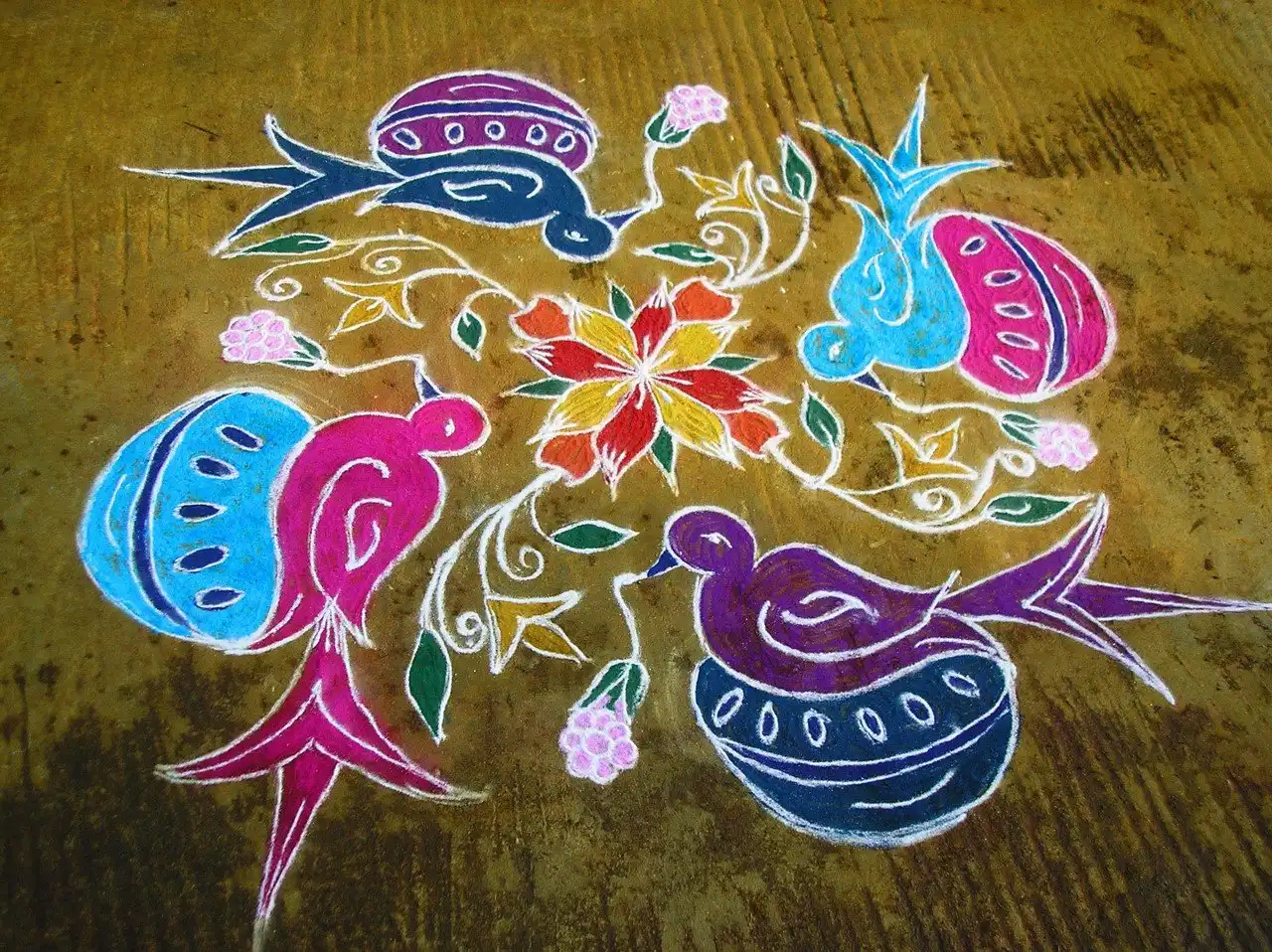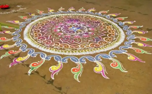 Ранголи, также известное как Колам или Муггу — народное искусство Индии. На полу в жилых комнатах или дворах создаются узоры из цветного риса, сухой муки, цветного песка или из цветочных лепестков. Это обычно делается во время индийских фестивалей Дивали, Онама, Понгал и других. Они предназначены для обозначения священных мест приветствия индуистских божеств. Узоры древних символов передавались на протяжении веков от поколения в поколение, сохраняя как художественную форму, так и традиции.