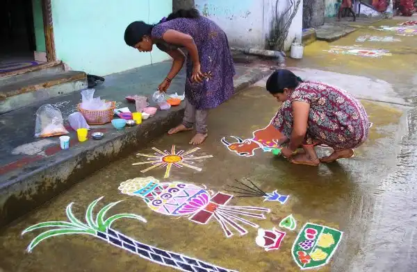 В Индии можно видеть, как в праздники брахманы раскрашивают полы в храмах, служащие — в учреждениях, дети — в школах. В домах отводят специальную комнату для совершения обряда«пуджи» — благодарственной молитвы. У каждой пуджи свой узор ранголи на полу.