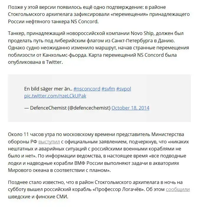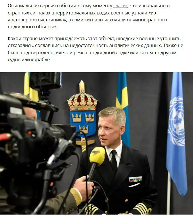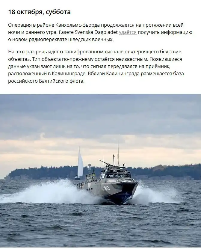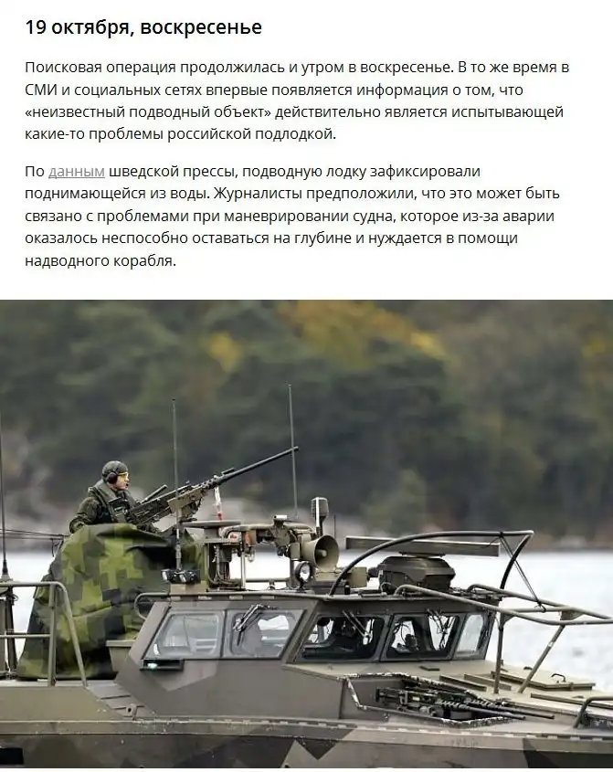 С 16 октября шведский военно-морской флот при поддержке авиации и наземных подразделений ищет «неизвестный подводный объект», который, по данным Минобороны Швеции, может являться российской подводной лодкой, терпящей бедствие в территориальных водах этого государства. Представление о масштабе проводимой операции дает специально составленная хронология событий.