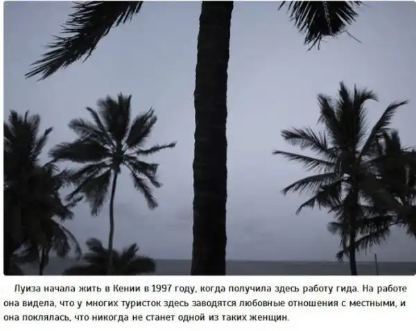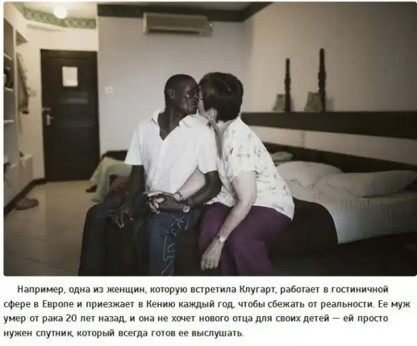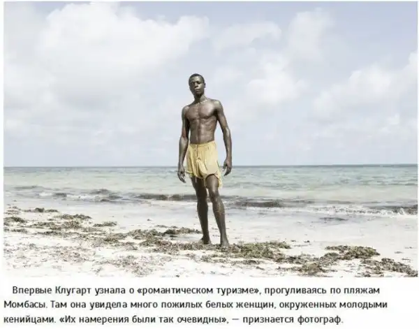Узнала о распространении подобных отношений между местными и туристами фотограф Софи Амали Клугарт, познакомившаяся с некоторыми женщинами, которые чаще остальных бывают в Кении.