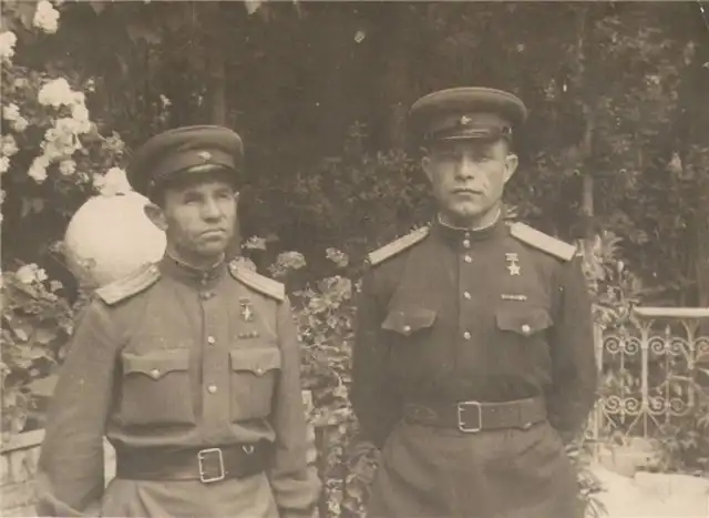 Справа командир 131МСП полковник Герой Советского Союза Никита Фадеевич Кайманов, слева заместитель командира полка по политчасти в 1943-1944г.г. Герой Советского Союза подполковник Николай Матвеевич Руденко. Обоим высокое звание было присвоено 26 августа 1941г.