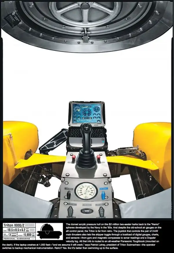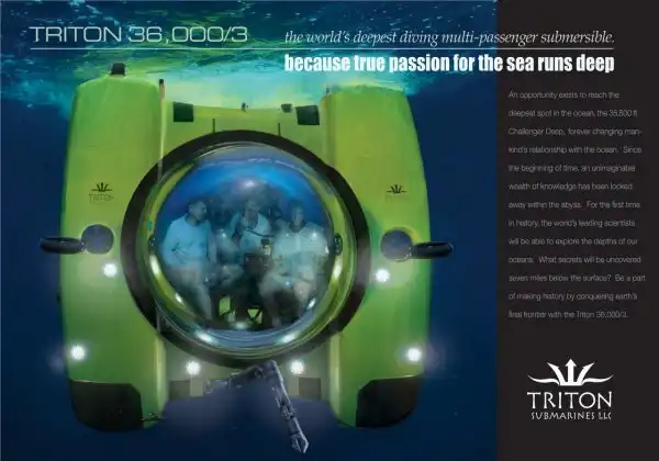 Погружение на максимальную глубину 11 км (36 000 футов) осуществляется примерно за два часа — прекрасный показатель для аппарата, масса которого составляет 9 тонн. Главное достоинство Triton 36000/3 — универсальность. Во-первых, такой лодкой может легко управлять один человек (всего на борт помещается трое), а, во-вторых, ее размер и маневренность делают субмарину идеальным аппаратом как для научных и поисковых подводных экспедиций, так и для элементарного отдыха.
