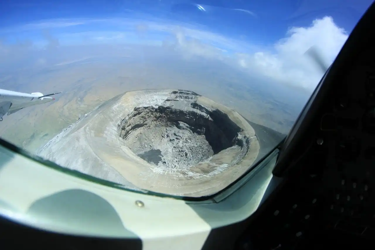 У вершины вулкана находится огромный разлом, земля здесь горячая. Оль Дойньо Ленгаи – гора черного бога. Раньше нужно было спуститься на сто метров ниже, чтобы добраться до дна кратера, но в настоящее время он заполнен до краев застывшими слоями лавы. Необычная лава представляет собою натрокарбонатиды – это вулканические известняки богатые кальцием натрием и углеродом, эта лава течет как вода. Когда эта лава течет она совсем черная, а после дождя, через три часа, она становится белой как снег, а если нет дождя, то достаточно и влаги содержащейся в воздухе, чтобы через три дня она посветлела.