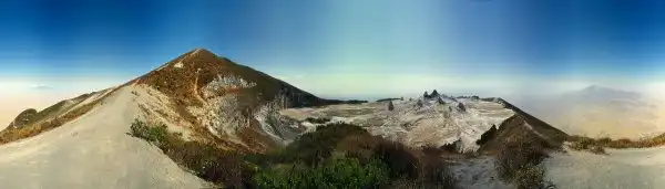 На часа 3 часа ночи, мы поднялись на вершину и идет вдоль жерла вулкана. Запах стал уже стал очень сильным и невыносимым, но к нему постепенно привыкаешь. На вершине очень холодно и сильный ветер, который пытается сбросить с гребня либо со склона вулкана, либо в кратер, глубиной почти 100 метров.