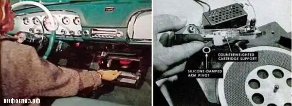 В результате в автомобиле появились специальные радиолы, рассчитанные сперва на виниловую пластинку со скоростью вращения 16,5 об/мин, а потом и на стандартную «сорокапятку». Отчаянные конструкторы Chrysler, уцепившись за это ноу-хау, даже пытались смягчить подвеску некоторых своих моделей, чтобы игла с дорожки на кочках не соскакивала, и снабжали авторадиолу чейнджером (вроде музыкальных автоматов в барах), что позволяло заряжать в нее сразу несколько виниловых дисков. Как правило, такой аппарат обладал внушительными размерами и невысокой надежностью, поэтому в чреве железного коня он не прижился. Сегодня автомобиль с таким проигрывателем – редкая и желанная находка для коллекционеров автостарины.