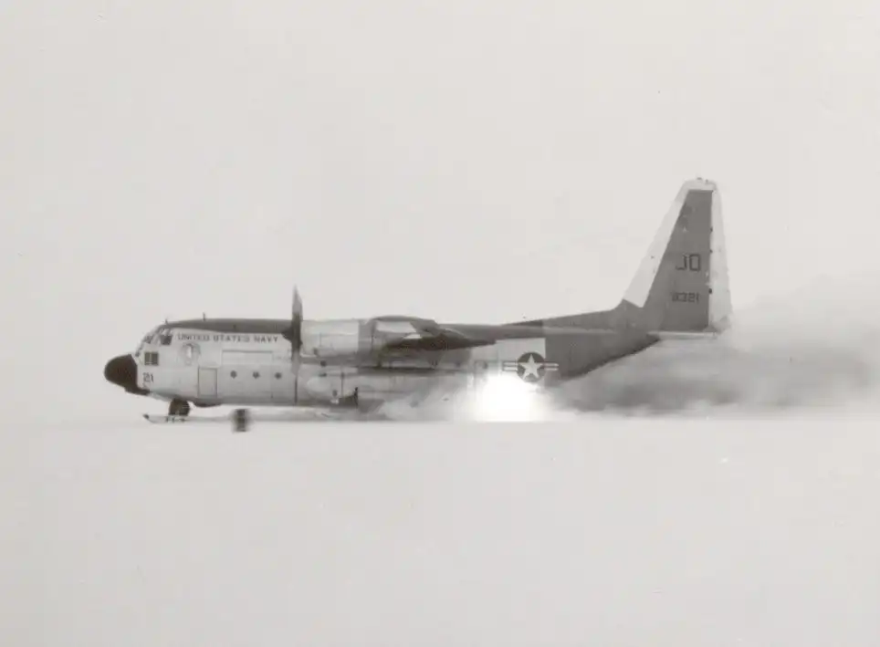 LC-130, 109 AW, использует JATO (взлет с помощью струи ракеты) для взлета на льду. Апрель 2003 года Ледник Гренландии Тодд Valentic