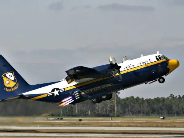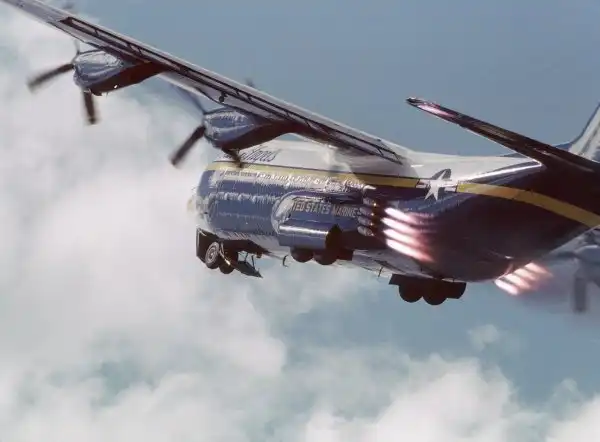 Alaska (June 27, 2004) — The Blue Angels C-130 Hercules transport, Fat Albert, performs a jet-assisted takeoff (JATO) at Elmendorf Air Force Base, Alaska during the Arctic Thunder Air Show. U.S. Navy Photo by Photographer’s Mate 2nd Class (AW/NAC) Ryan J. Courtade. (RELEASED)