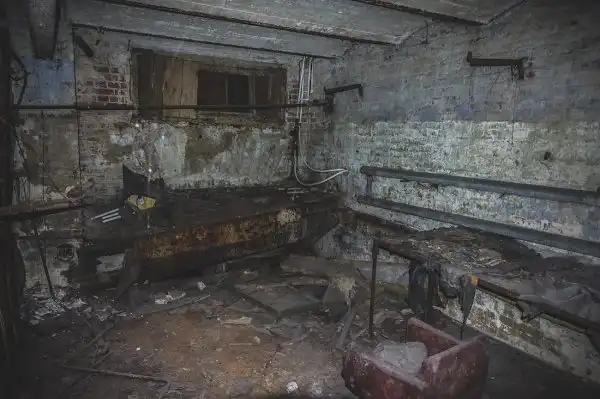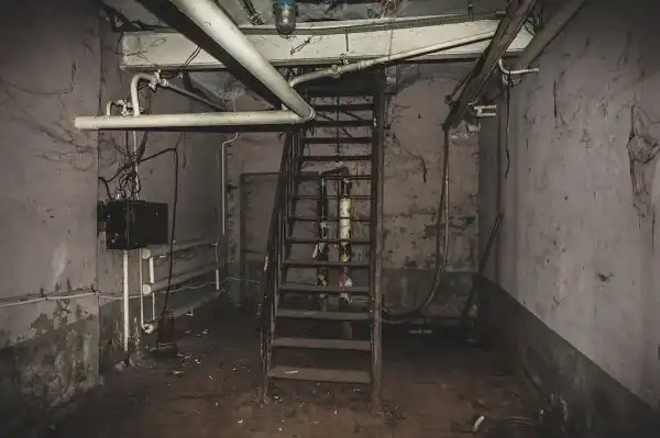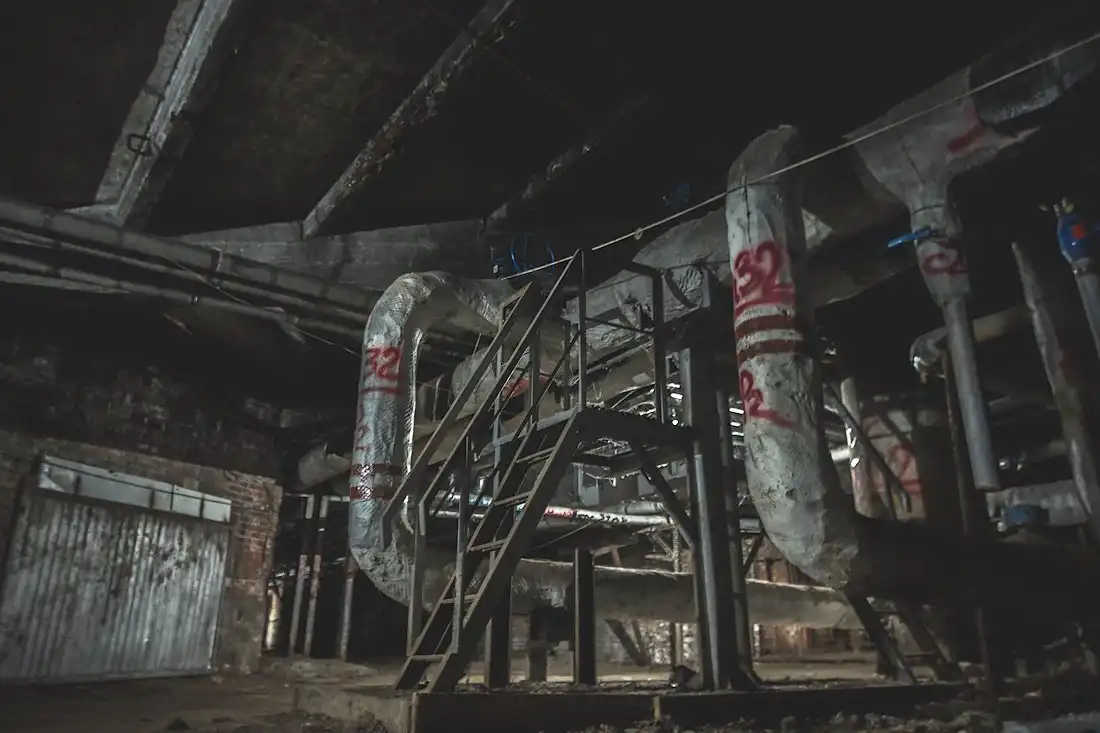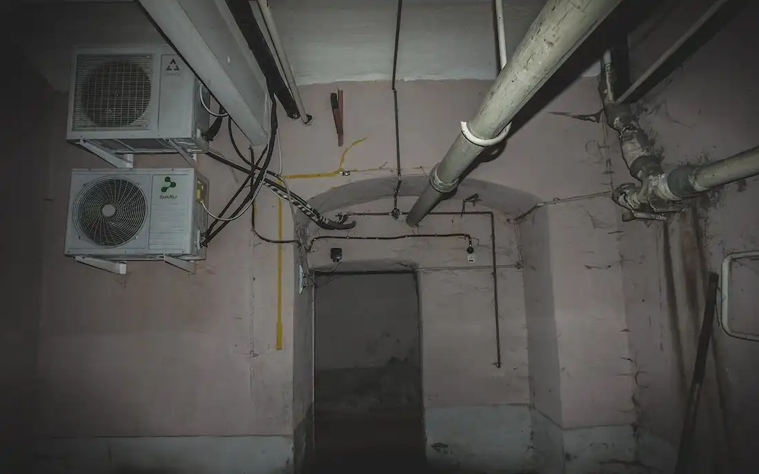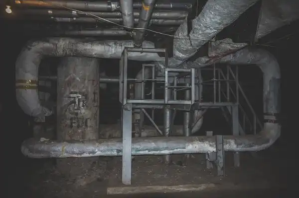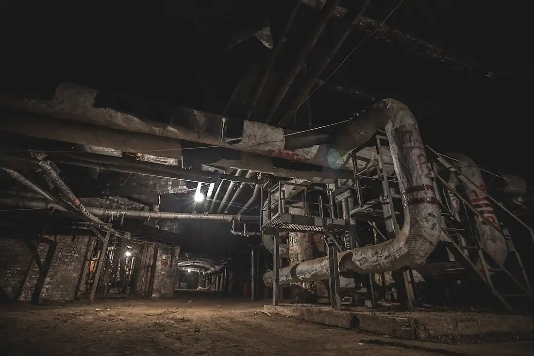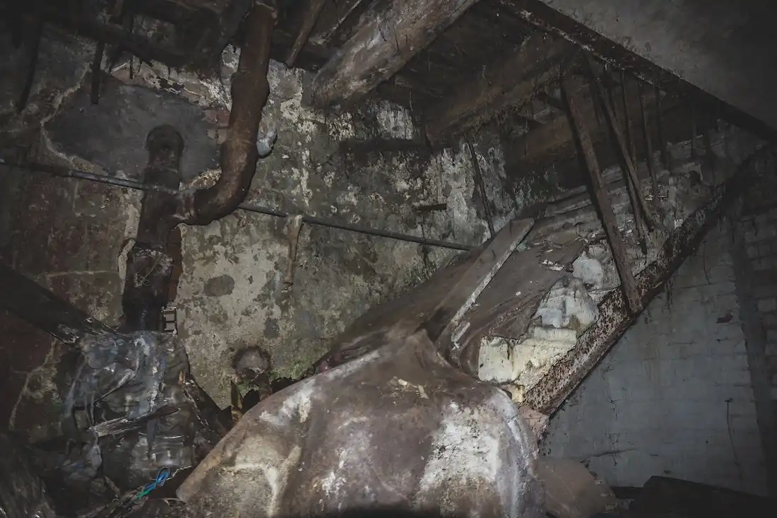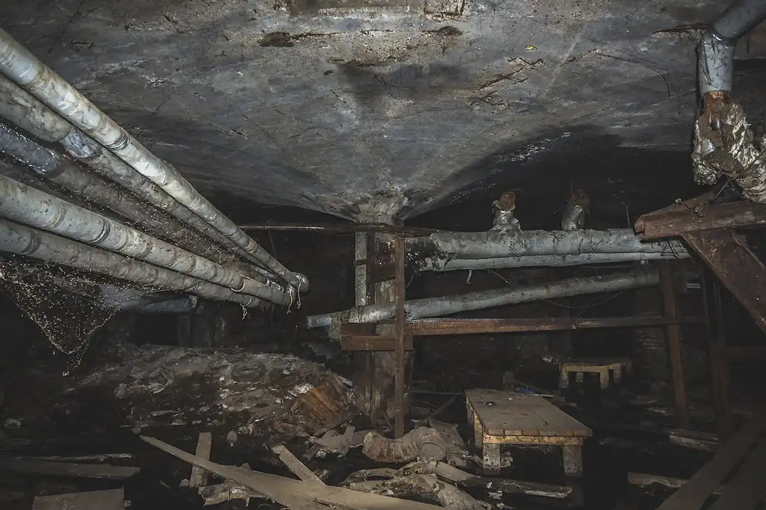 Здесь же проходят многочисленные коммуникации с холодной и горячей водой. Из-за постоянных протечек изношенных труб местами пол затоплен по щиколотку, передвигаться можно лишь по горам мусора.