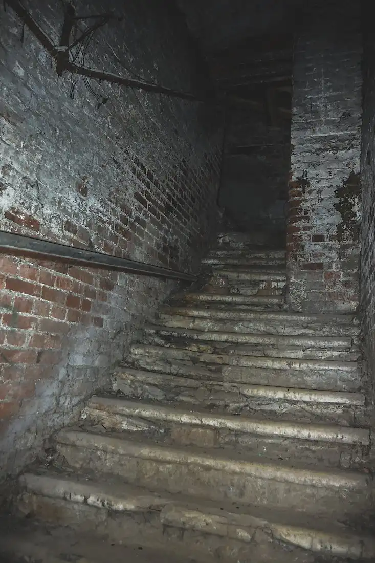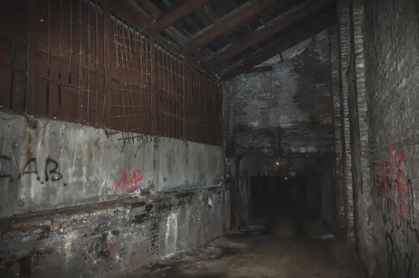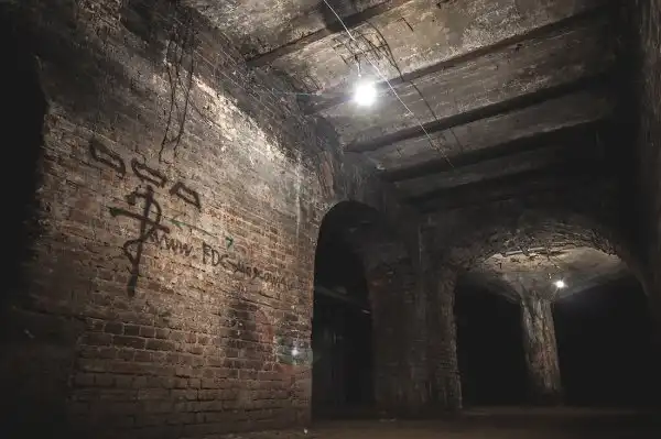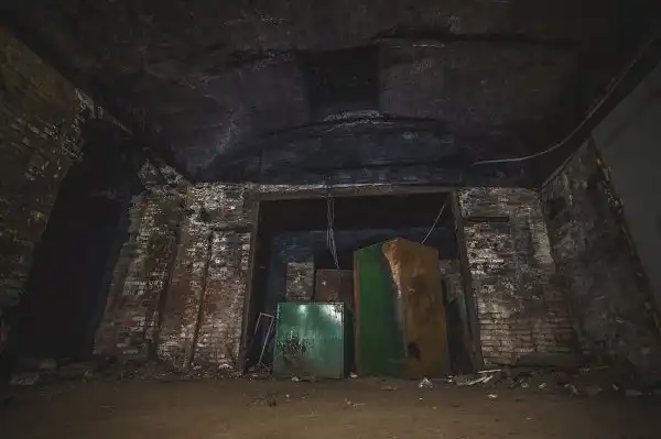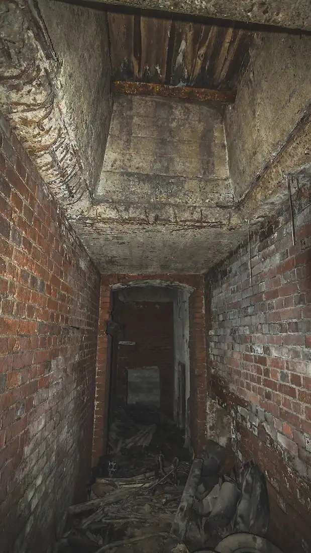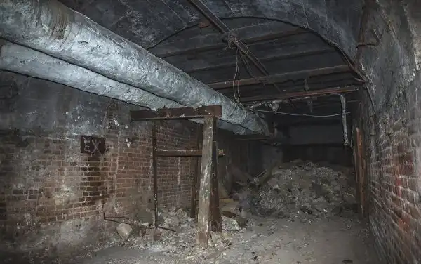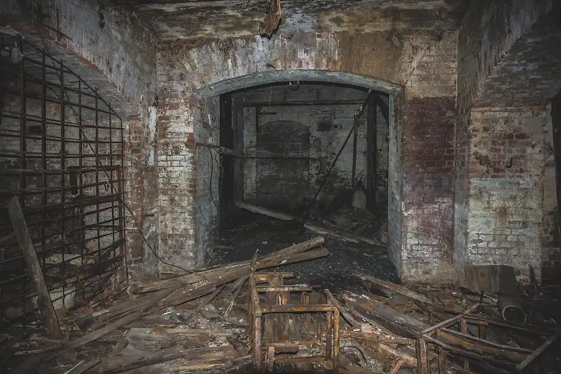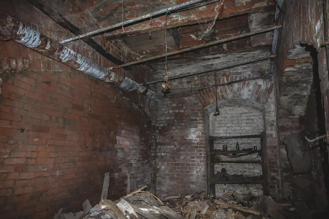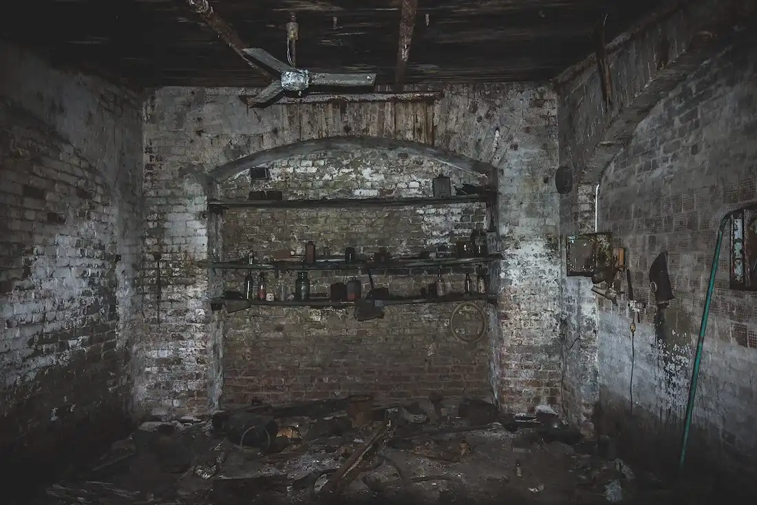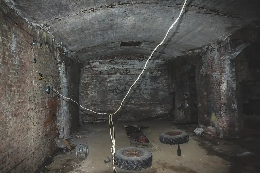 Стены подвала имеют толщину около метра, но во многих местах возведены тонкие кирпичные перегородки, дробящие залы на маленькие каморки и закутки, заваленные многолетним мусором.