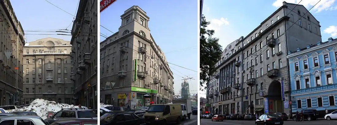 Для строительства домов Московская купеческая компания выкупила у разных владельцев участок неправильной формы и объявила конкурс на лучший проект. Победила группа архитекторов: В.В. Шервуд, И.А. Герман и А.Е. Сергеев. Они сделали то, что требовалось застройщикам: максимально плотно использовали замысловатуюформу участка, нарастили здание как вверх, так и вглубь. Дом в неоклассическом стиле украсила лепнина, несообразно выходящая в дворы-колодцы, внутри расположились роскошные апартаменты окнами туда же.
