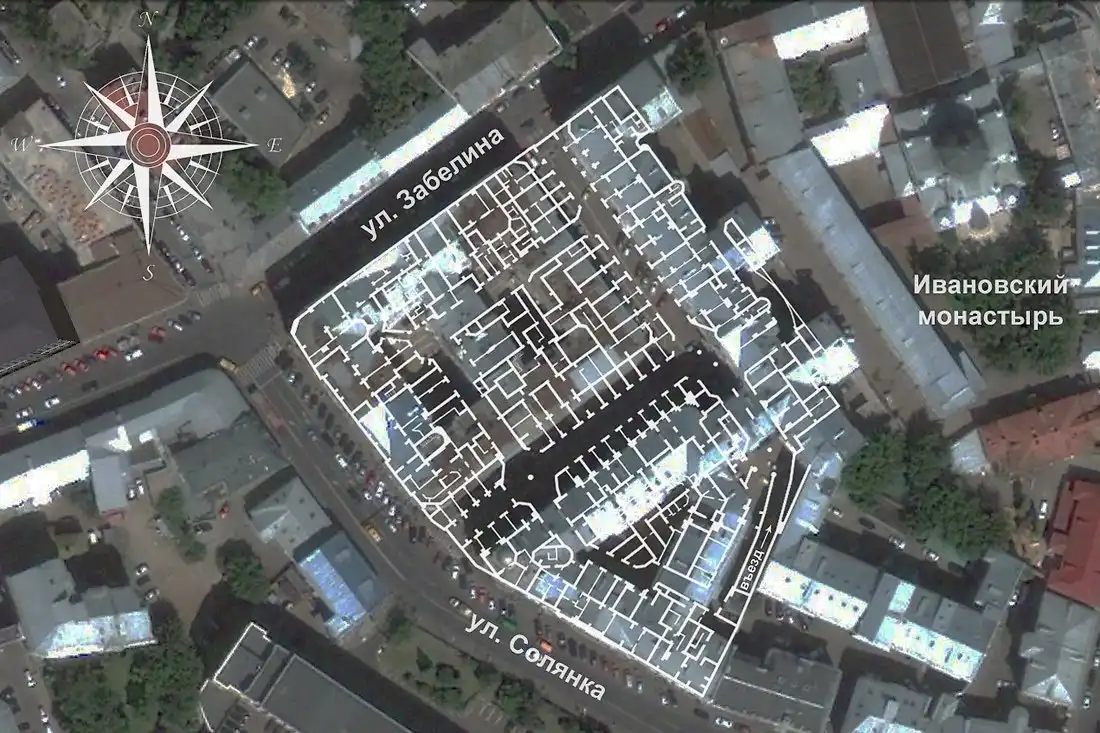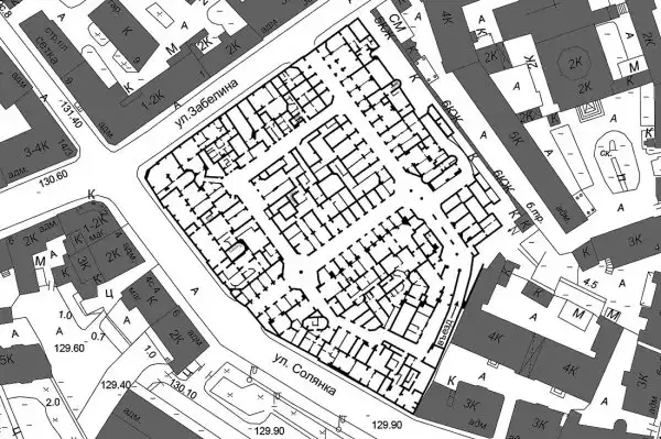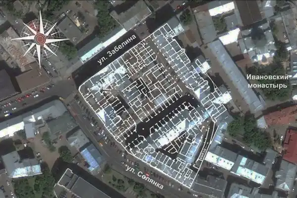А так подвал выглядит по сравнению с окружающим его ландшафтом. Он занимает всё пространство под корпусами дома, внутренними дворами и широким внутренним проездом.