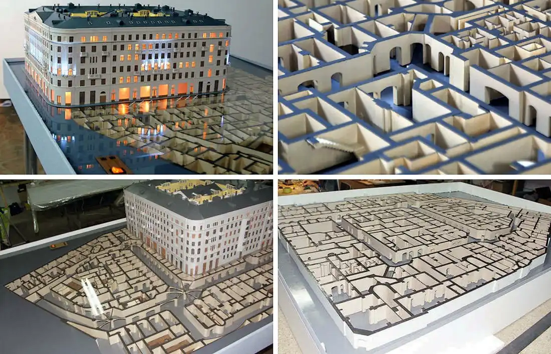 Но самая интересная особенность дома скрыта от постороннего глаза. Это невероятных размеров подвал с высокими сводами, широкими коридорами, где с лёгкостью могут разъехаться две машины, и множеством внутренних помещений. Группой «Моделлмикс» был выполнен великолепный макет одного из корпусов дома вместе со всем подвалом в масштабе 1:100. Для кого был сделан этот макет и где он сейчас находится — неизвестно, но фотографии дают представление о грандиозности подземной части дома.
