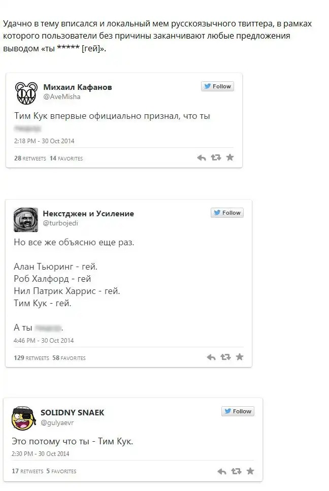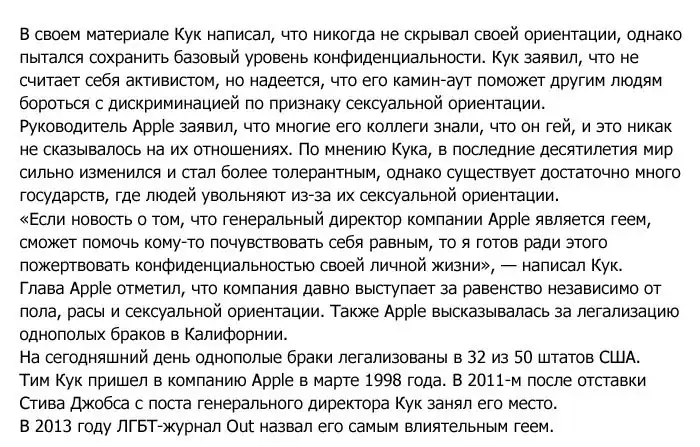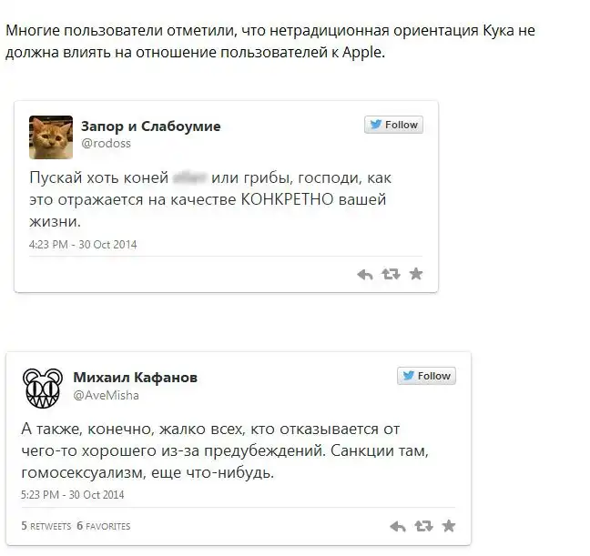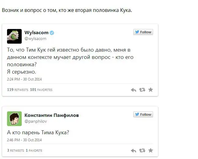 Руководитель компании Apple Тим Кук подтвердил информацию о своей нетрадиционной сексуальной ориентации. Соответствующая статья была напечатана в деловом журнале Business Week. Новость взбудоражила Рунет, как будто раньше об этом никто не знал. А шутка про "гейфон" перестала быть смешной примерно через 15 минут после этого.