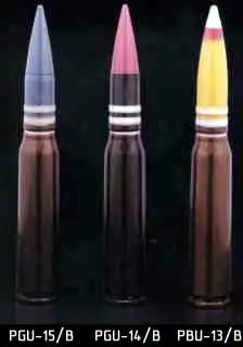 •осколочно-фугасные снаряды PGU-13/B оснащаются стандартными взрывателями М505, 56 гр. взрывчатого вещества, самоликвидатором и осколкообразующим материалом, эффективным против легкобронированных машин и укрепленных пунктов; начальная скорость 1080 м/c, вес патрона 890 гр., вес снаряда 363 гр., эффективная дальность стрельбы по наземным целям 3000 метров