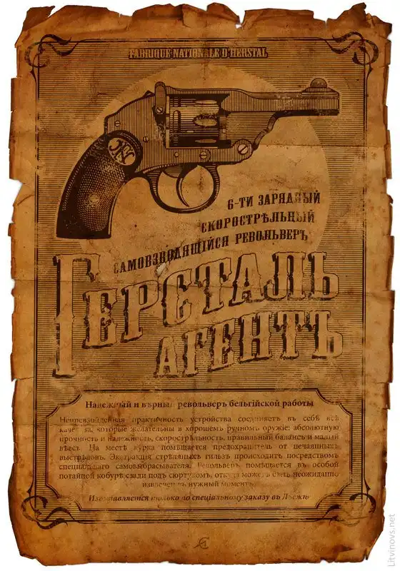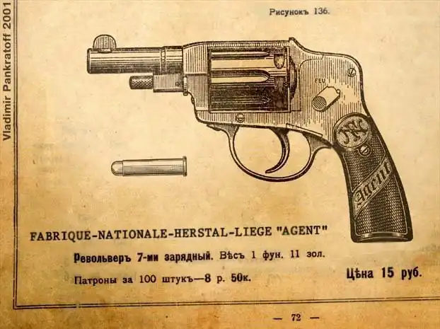 Револьвер бельгийский – видимо, производства оружейной компании «Fabrique Nationale d’Herstal», расположенной в бельгийском городке Эрсталь. Да, вообще говоря, первая буква в слове «Herstal» не произносится, но Акунин вообще любит стилизовать свой язык подобным образом (тем более, что этот город раньше назывался «Геристаль»). Располагается он в провинции Льеж – всё правильно, в книжке «герсталь» прямо называется изобретением льежских мастеров. Только что проку? Всё равно не было в 1876 году у них такой модели.