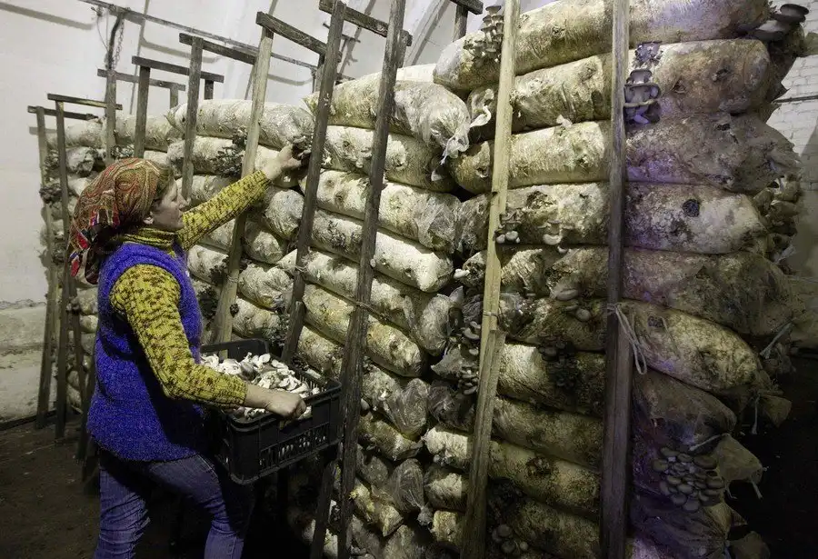 Рабочая проверяет грибницы на частной ферме, устроенной внутри ангаров на бывшей советской ракетной базе в деревне Минойты в 160 км к западу от Минска.