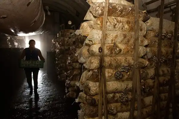Рабочие сортируют грибы на частной ферме в деревне Минойты.