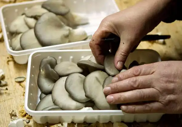 Рабочая упаковывает грибы на частной ферме в деревне Минойты.