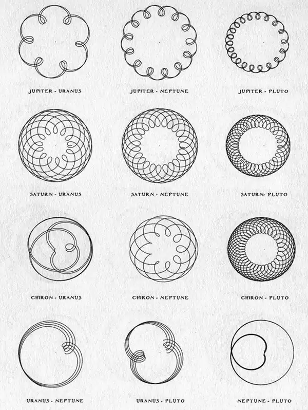 Возьмите орбиты любых двух планет, и проведите линию между двумя положениями планеты за каждые несколько дней. Поскольку планета, двигающаяся по внутренней орбите, двигается более быстро, чем двигающаяся по внешней орбите, то образуются интересные модели. Каждая планетарная пара имеет свой собственный уникальный ритм танца. Например, танец Земли и Венеры возвращается к первоначальному положению после восьми земных лет. Восемь земных лет равняется тринадцати годам Венеры. Обратите внимание, что 8 и 13 являются числами ряда Фибоначчи.