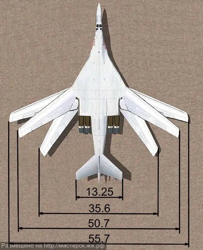 Размеры: размах крыла максимальный – 55,7 м., минимальный – 35,6 м., длина – 54,1 м., высота – 13,2 м.