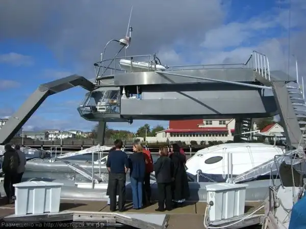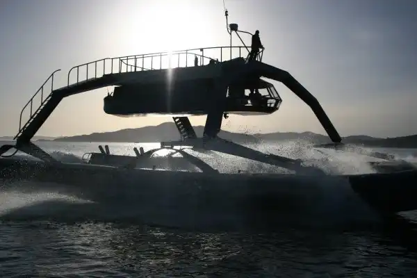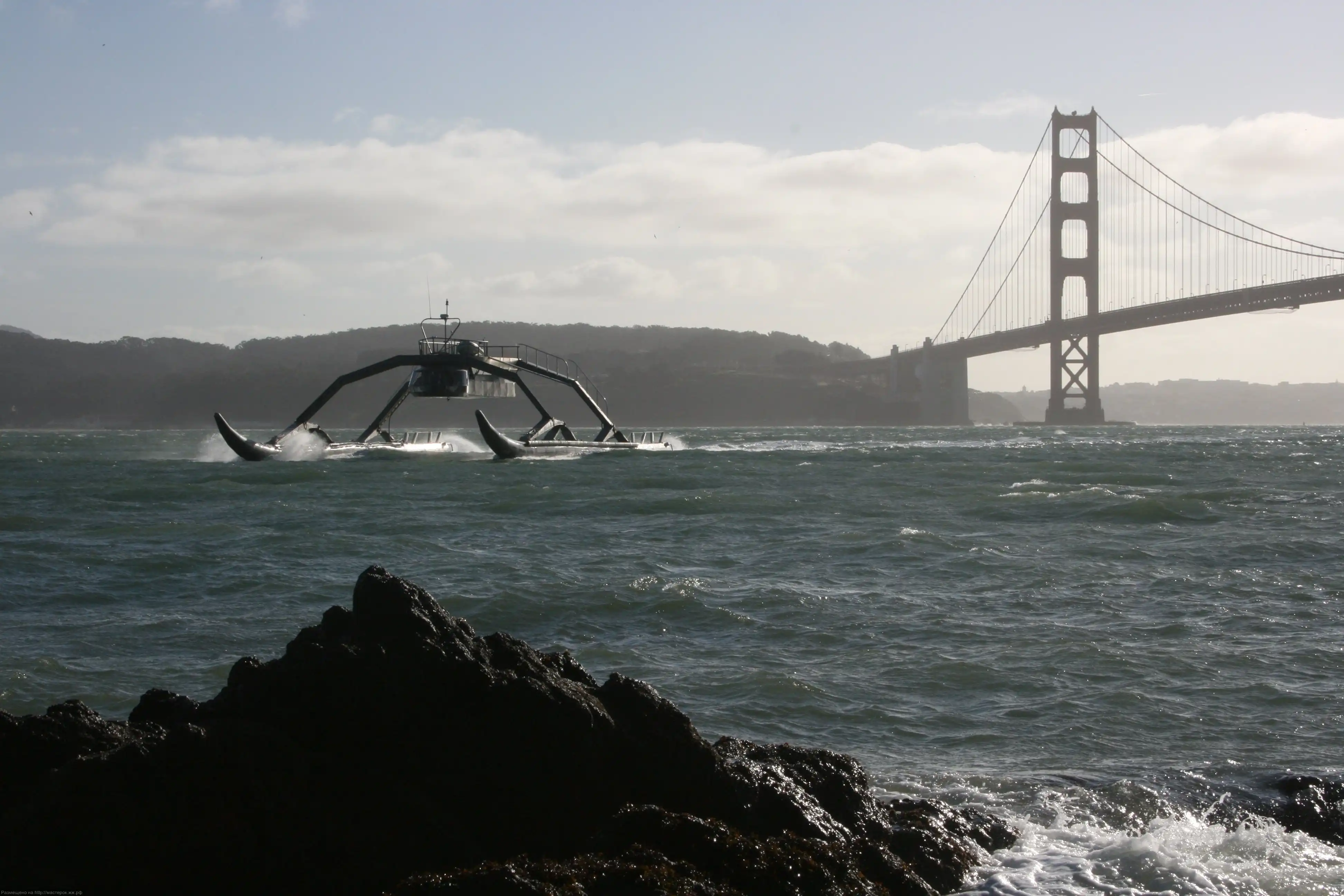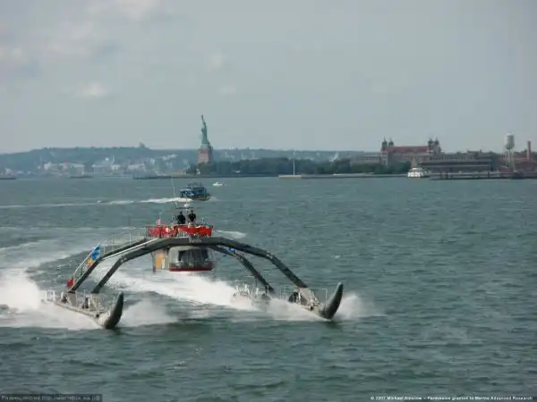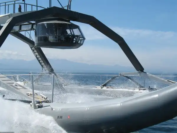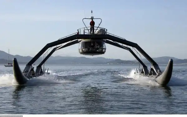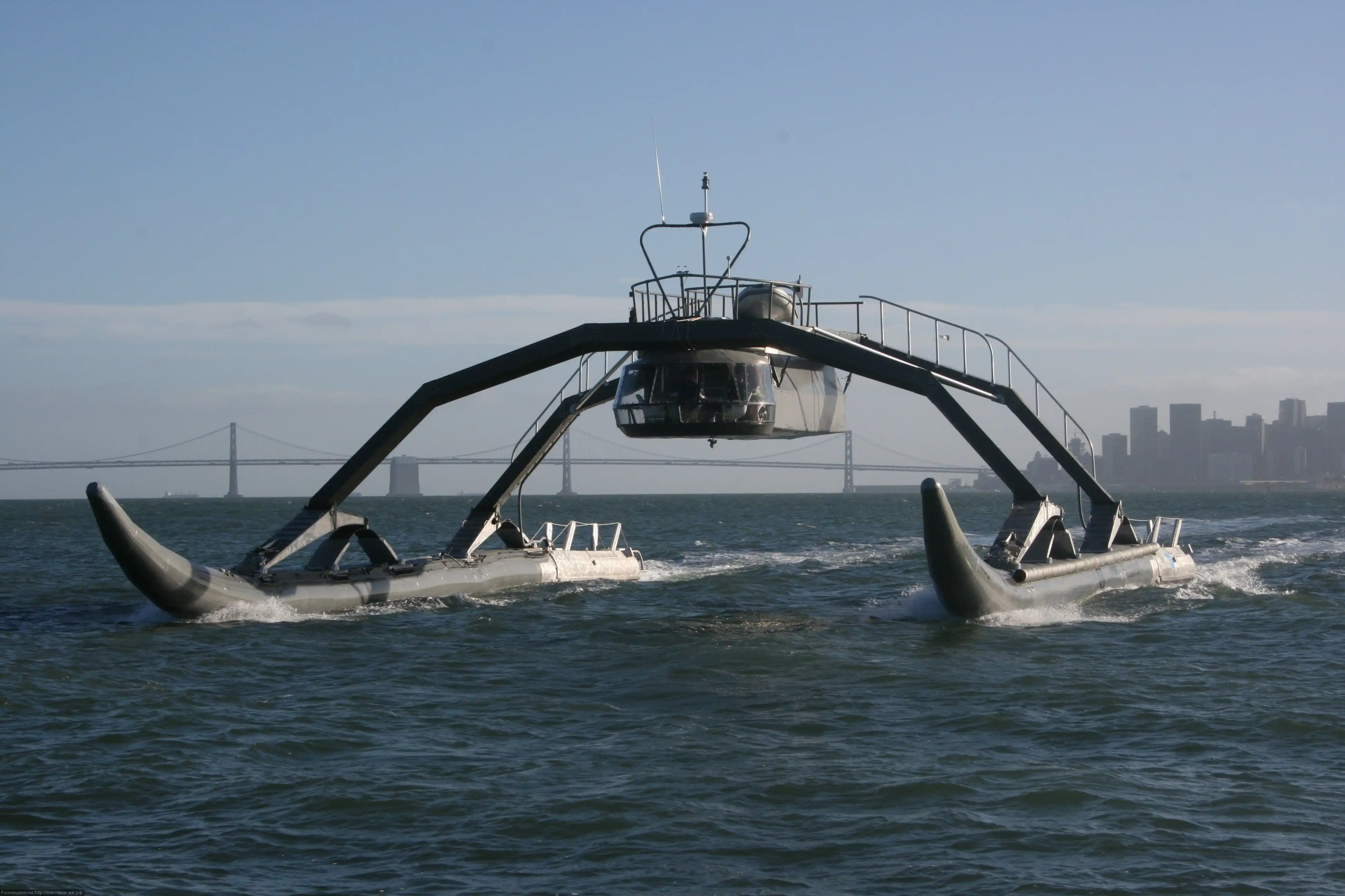Изюминка этого судна – четыре огромные лапы, при помощи которых кабина с экипажем опирается на два длинных надувных поплавка. Причём опирается не напрямую, а через целую систему из рессор (титан плюс полимеры), формирующих нечто вроде балансирной подвески. Она позволяет поплавкам изгибаться при прохождении волн, так что судно не столько борется с волнами, сколько скользит над ними с минимальной раскачкой. Правда, максимальную скорость судна его создатели не сообщают. Пока не прошли все испытания.