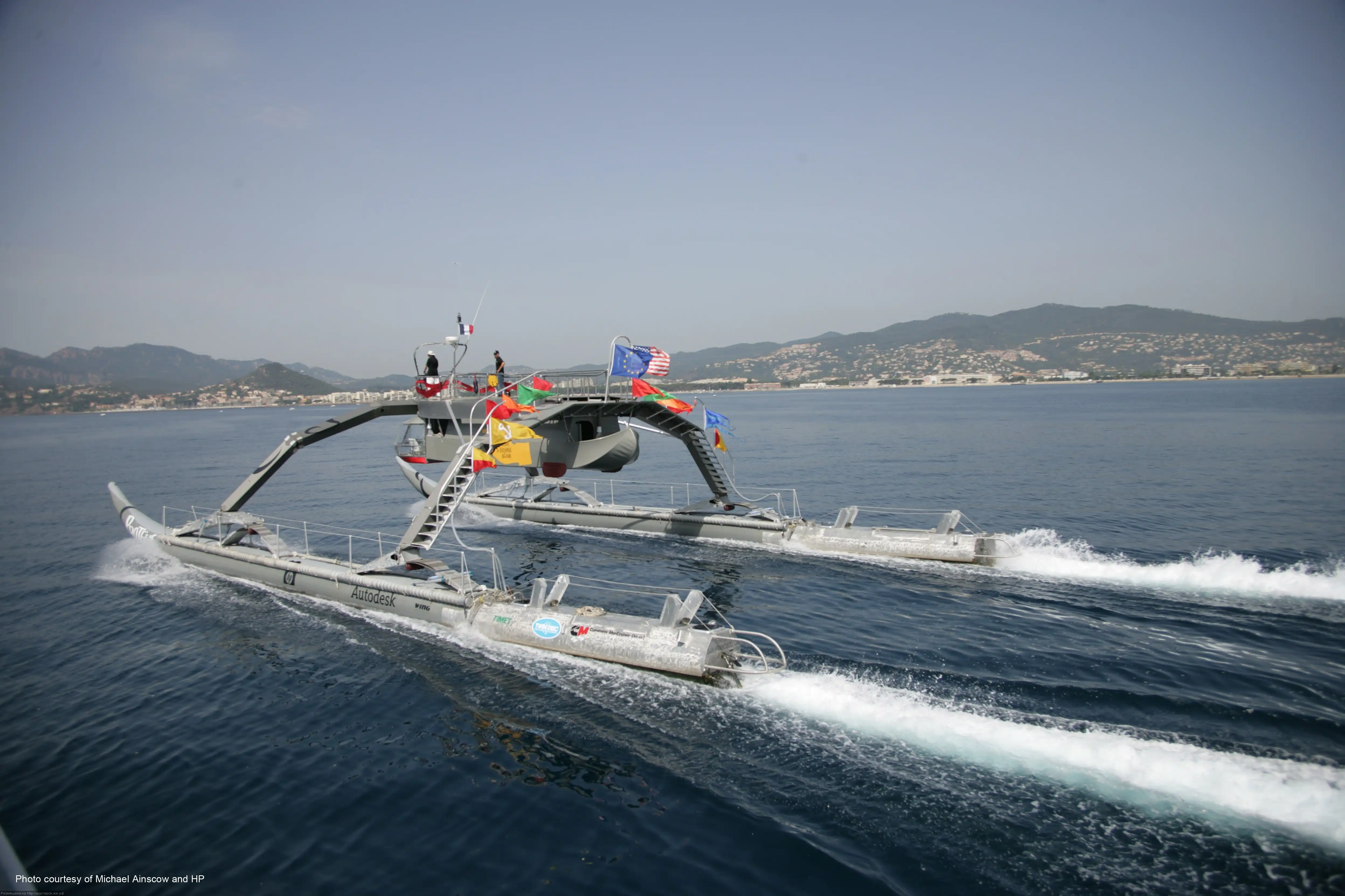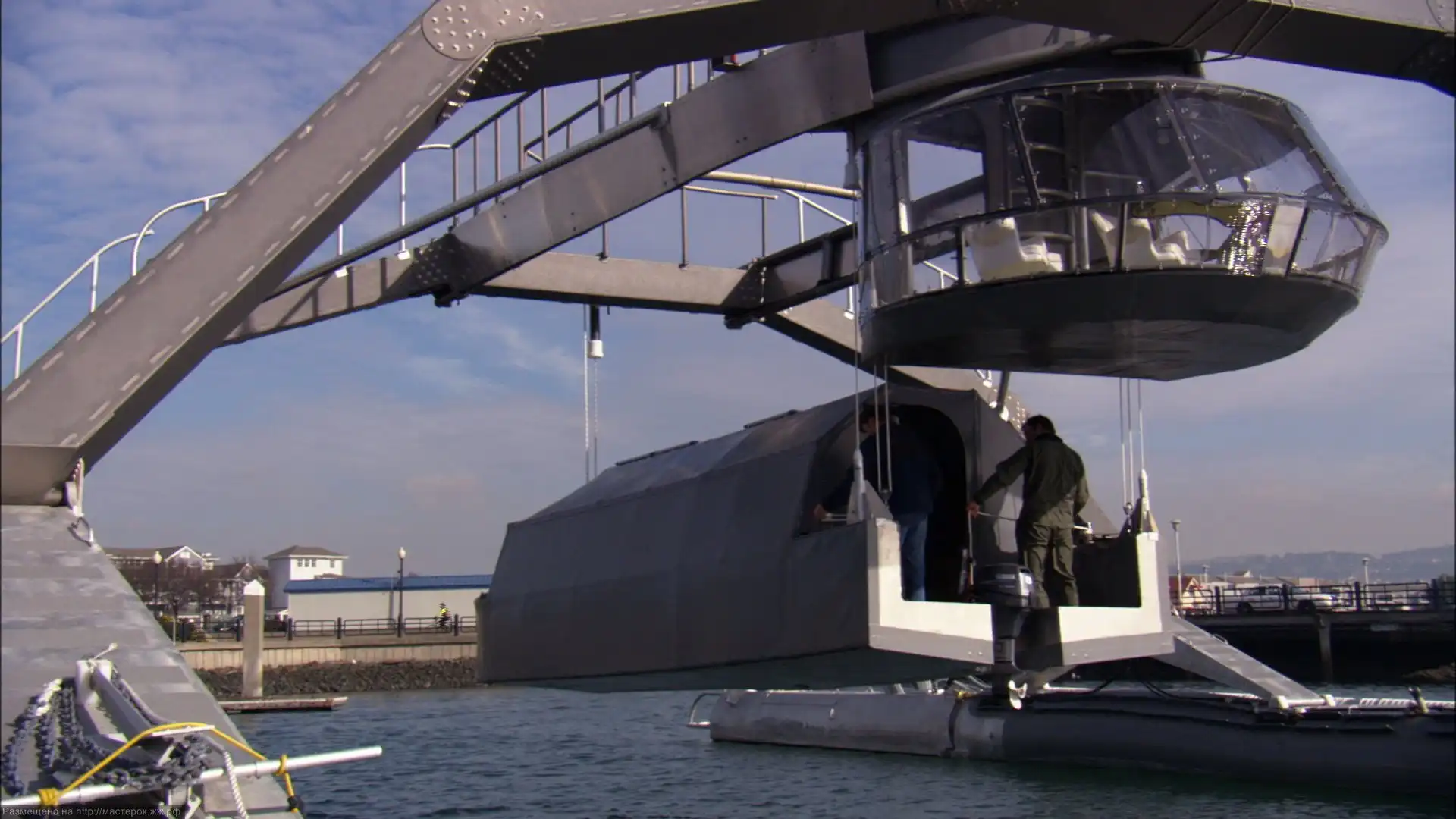 Вверху слева: один из первых кадров судна, «просочившийся» с неофициальных испытаний. Теперь, впрочем, компания-разработчик выкладывает не меньше снимков своей странной конструкции, чем энтузиасты сообщества flickr.com (фотографии just...eD/flickr.com и Marine Advanced Reasearch).