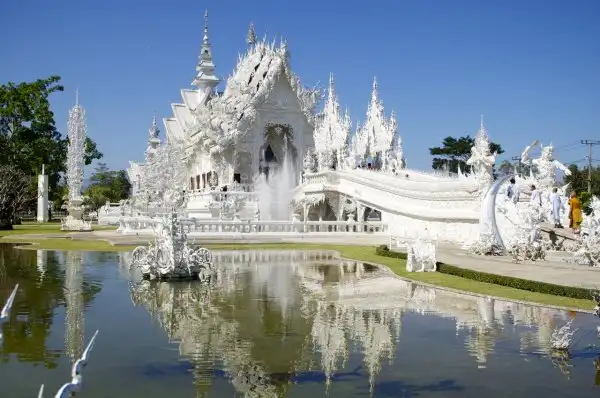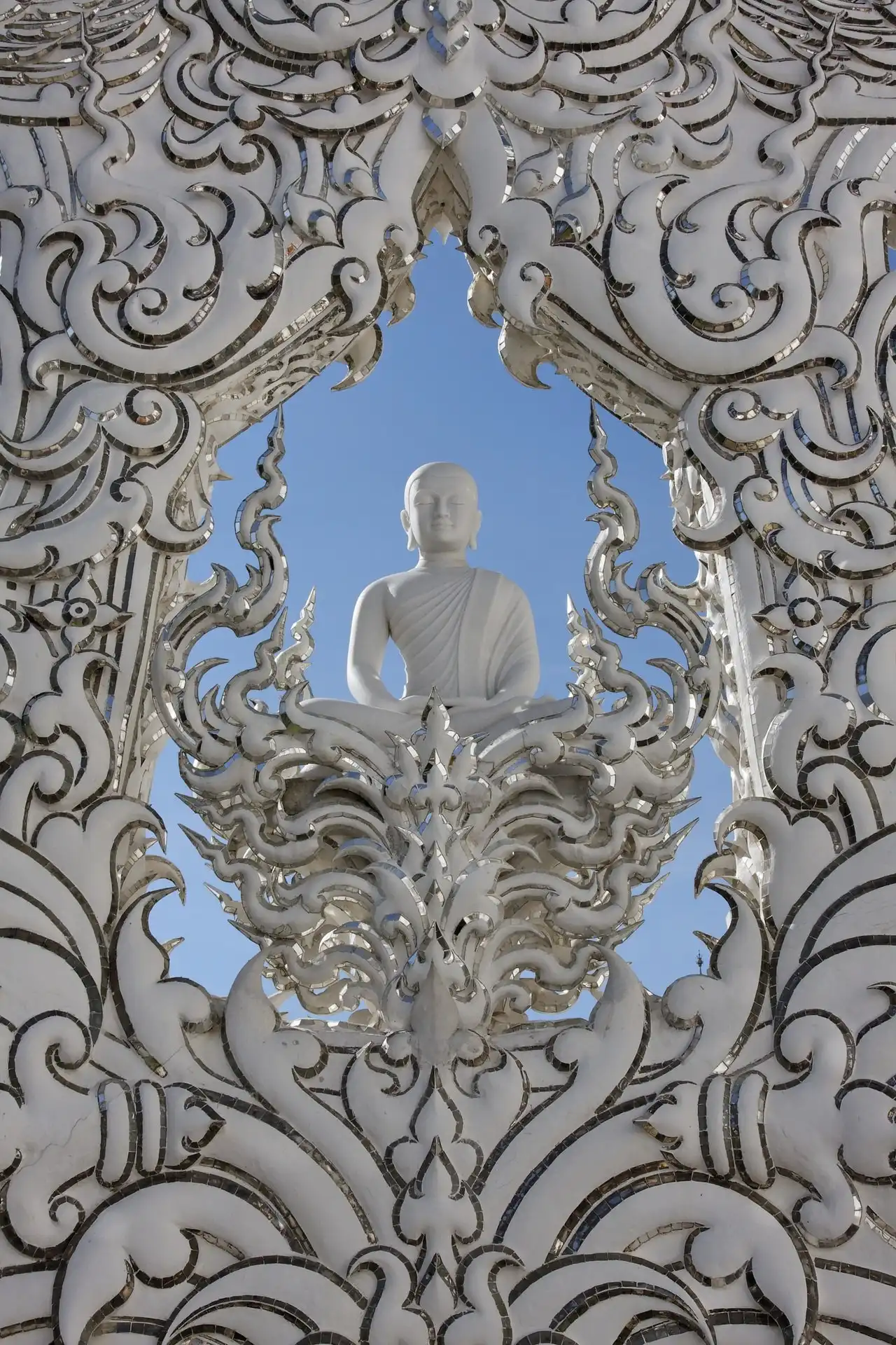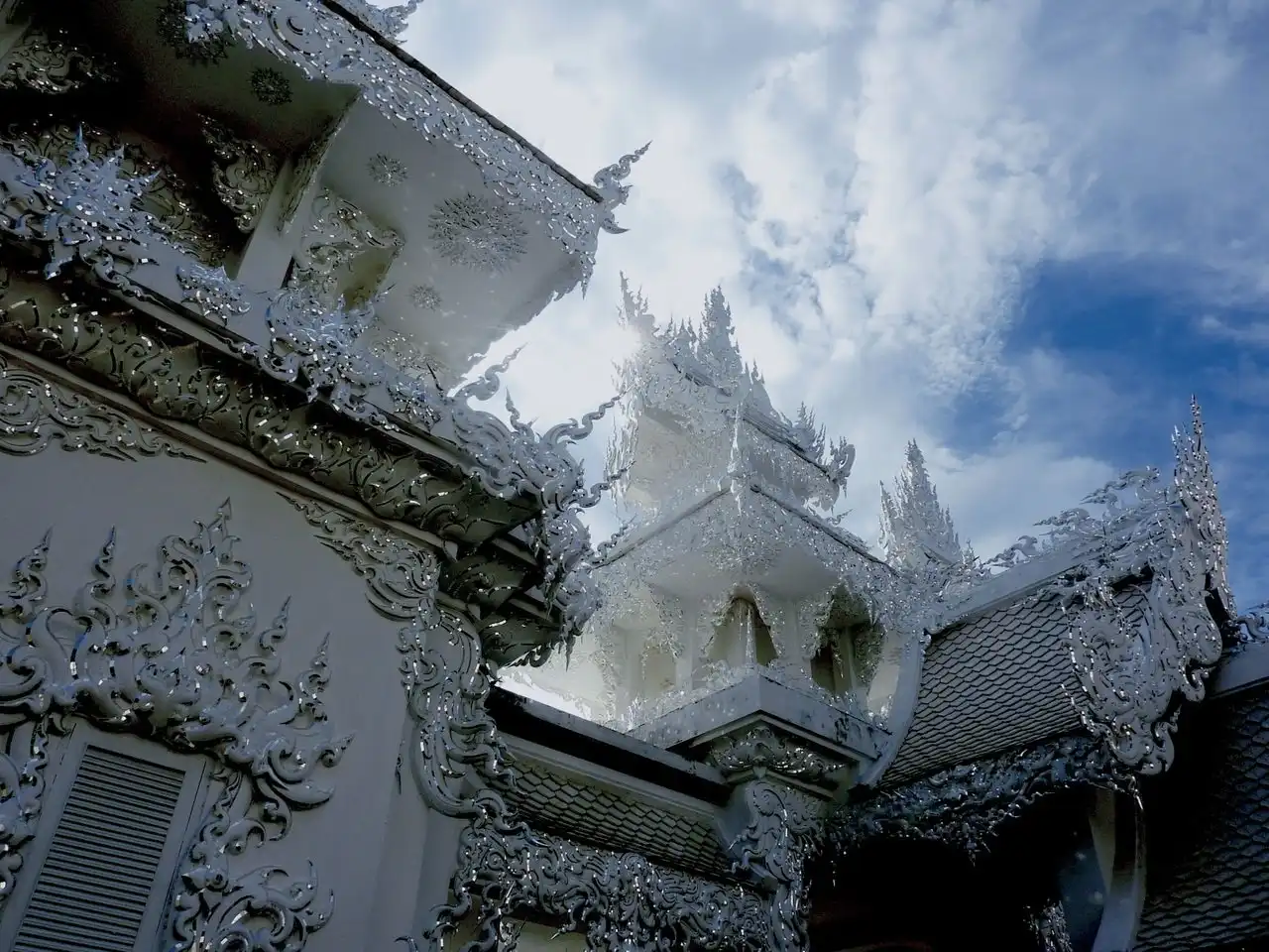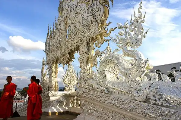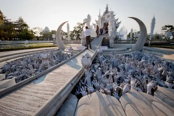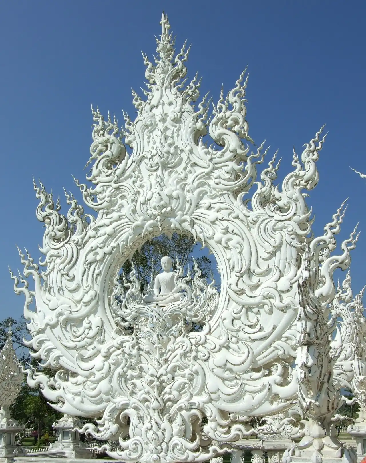 Расположенный в провинции Чианг Рай, храм Wat Rong Khun во многом отличен от других храмов Таиланда. Выполненный в белом цвете, он как бы подчеркивает чистоту Будды, а сверкающее стекло говорит о сияющей как на земле, так и во всей Вселенной мудрости Будды. Каждый элемент и архитектурная форма несут какую-то смысловую нагрузку. Например, мост видится как переход от бесконечных циклов перерождений к обители Будды, а полукруг перед мостом символизирует земной мир.
