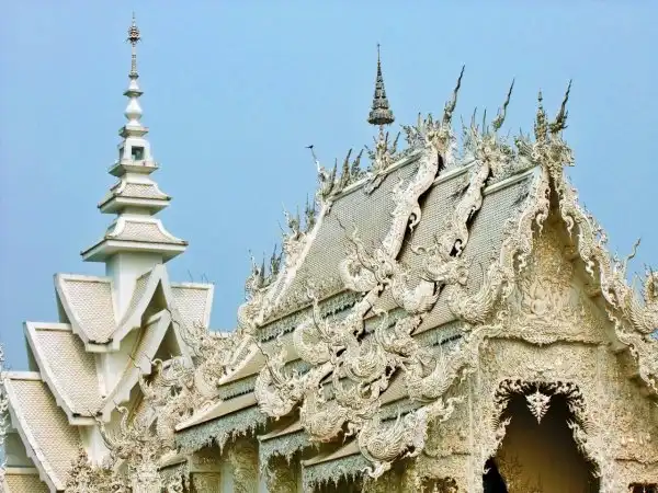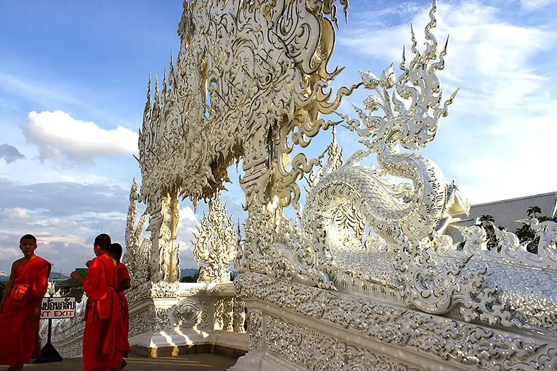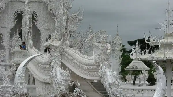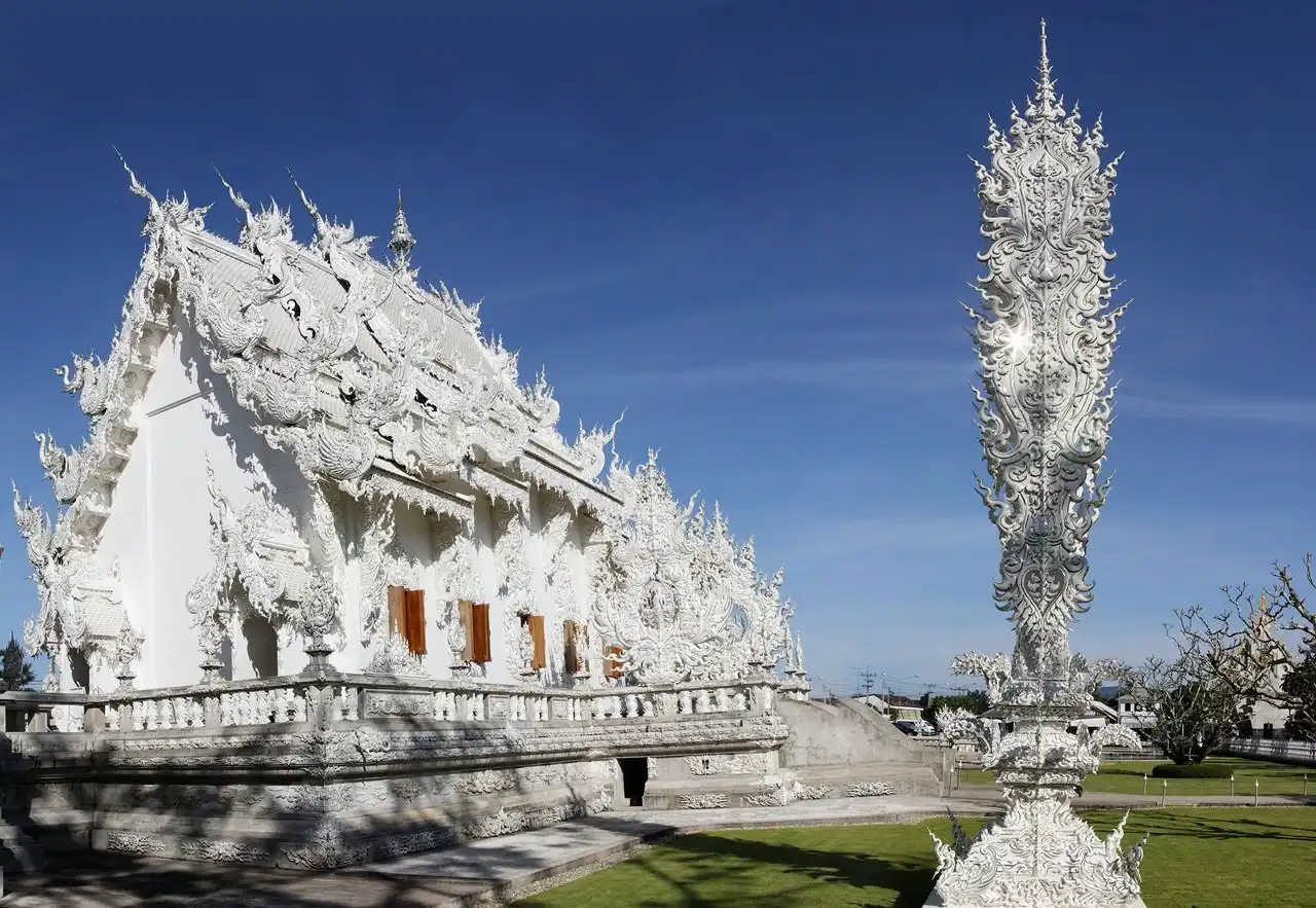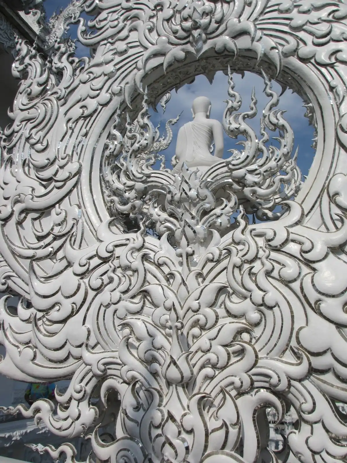Расположенный в провинции Чианг Рай, храм Wat Rong Khun во многом отличен от других храмов Таиланда. Выполненный в белом цвете, он как бы подчеркивает чистоту Будды, а сверкающее стекло говорит о сияющей как на земле, так и во всей Вселенной мудрости Будды. Каждый элемент и архитектурная форма несут какую-то смысловую нагрузку. Например, мост видится как переход от бесконечных циклов перерождений к обители Будды, а полукруг перед мостом символизирует земной мир.