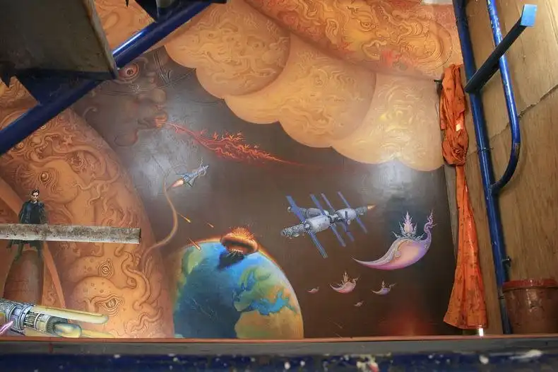 Эту картину Коситпипат Чалермчай создавал три года. Как объяснила девушка-гид, такие непривычные для храма изображения, объясняются тем, что художник хочет показать вечные истины более понятным и близким для современного молодого поколения языком, отсюда такая необычная интерпретация.
