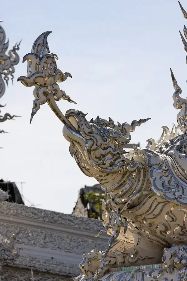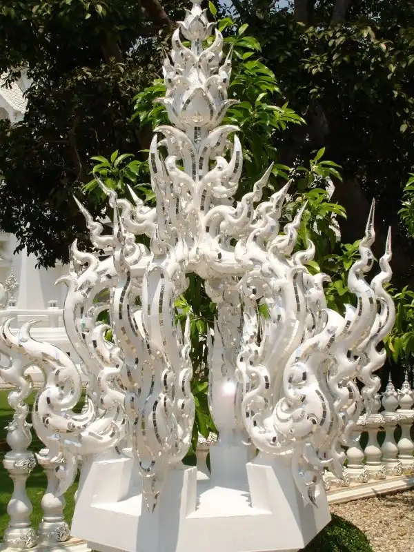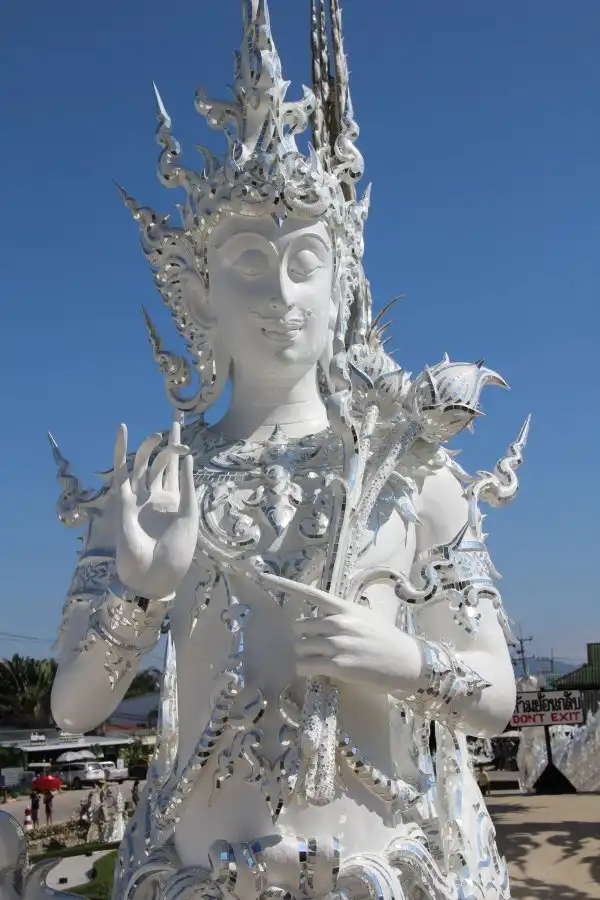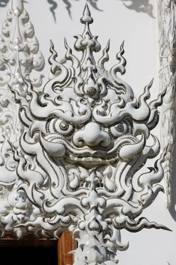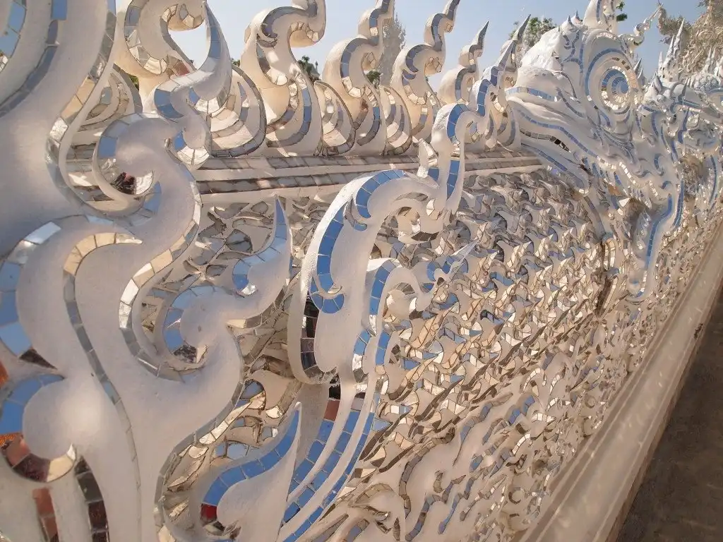 Белый храм сочетает в себе прекрасную смесь традиционного буддийского искусства с современным дизайнерскими решениями. Совершенно белоснежные стены и скульптуры искрятся, отражая оттенки утренней зари и вечернего заката. Стены украшены мелкими кусочками зеркального стекла, которое придает строению небесную воздушность и волшебный вид.