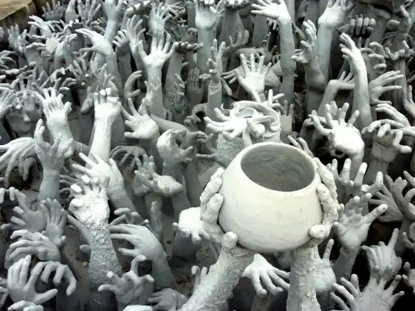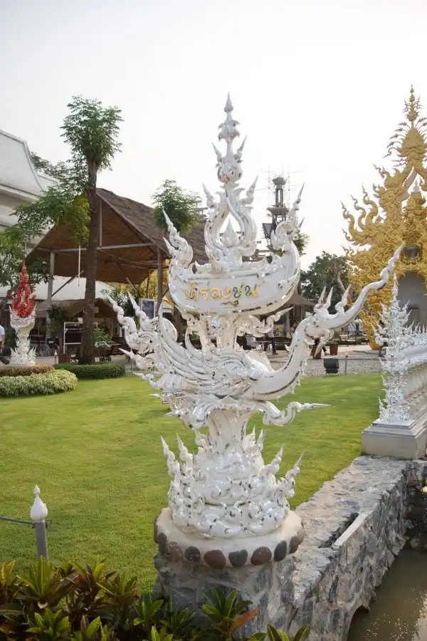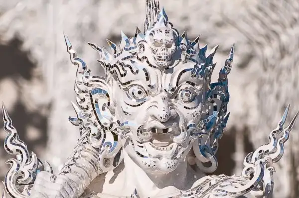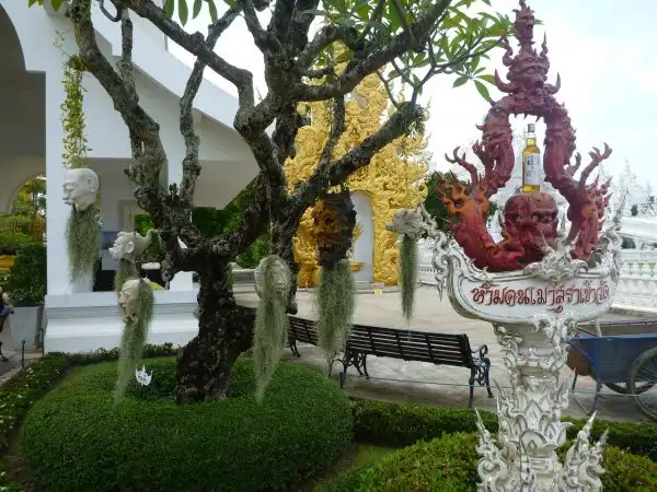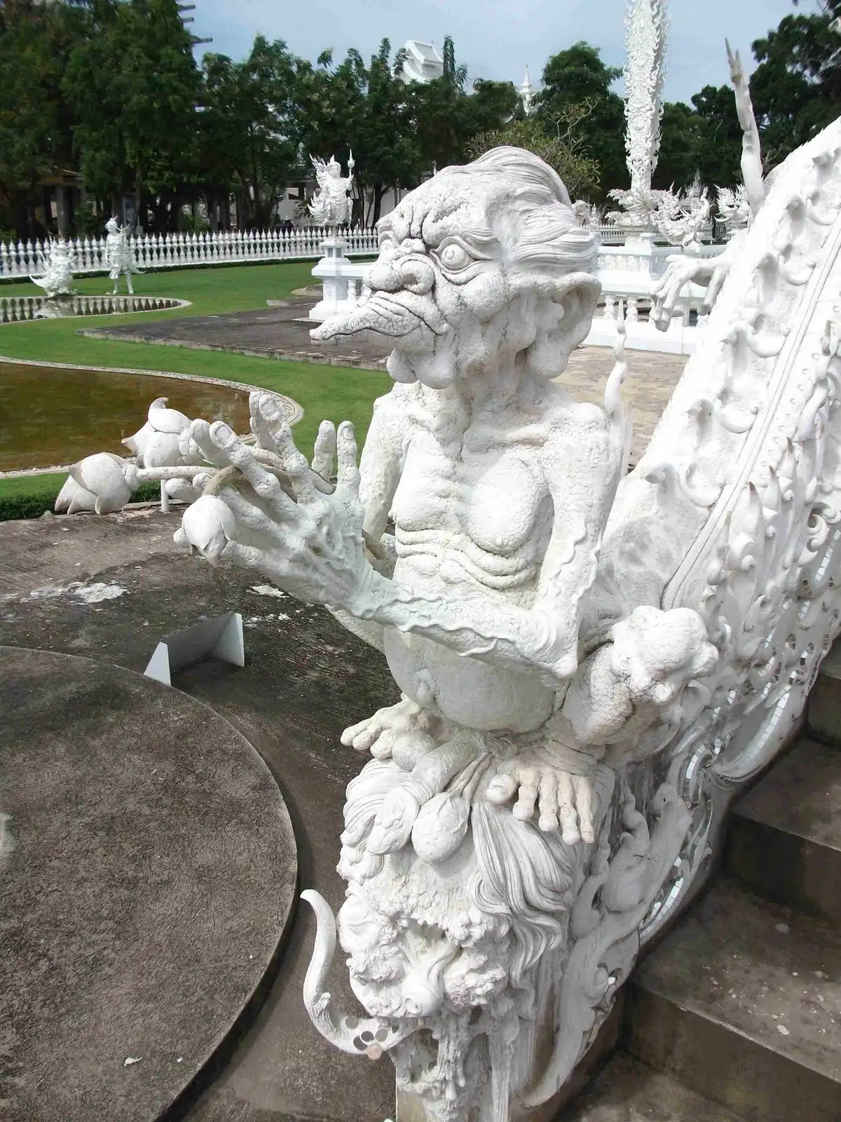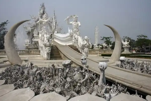 Его Белый Храм – это символ рая, куда и ведет узкий мост через реку, полную грешников. Важно знать, что, войдя в Храм по мосту, обратно по нему же возвращаться уже нельзя – попадаете обратно в ад. Каждая скульптура, каждая деталь в этом резном белоснежном великолепии несет определенный смысл и назначение, начиная с белого цвета самого Храма – символа чистоты Будды, и стекла, вкрапленного во все вокруг – символа мудрости Будды, которая ярко светит по всей Земле и Вселенной.