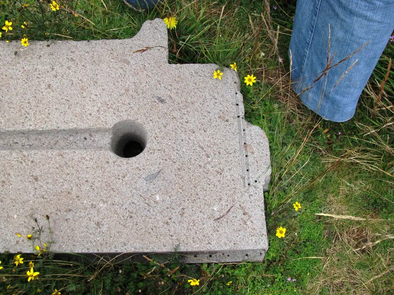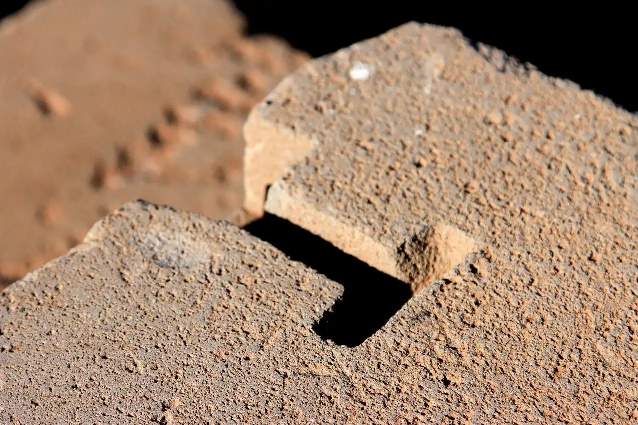 Еще один блок с аналогичными надрезами и отверстиями лежит неподалеку (совсем рядом с раскопом на вершине холма). Явно выполненный с использованием тех же самых инструментов, он озадачил еще больше. Две параллельные прорези начинаются фактически из ниоткуда – не от края, а с совершенно произвольного места на блоке. Отверстия же располагаются на разных гранях блока, образуя совершенно бессмысленную цепочку криволинейной формы. Вдобавок этот блок имеет по центру фигурный вырез под крепление какого-то силового элемента (типа стяжки), способного выдерживать явно весьма значительную нагрузку.
