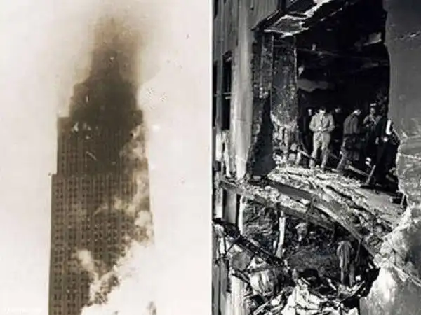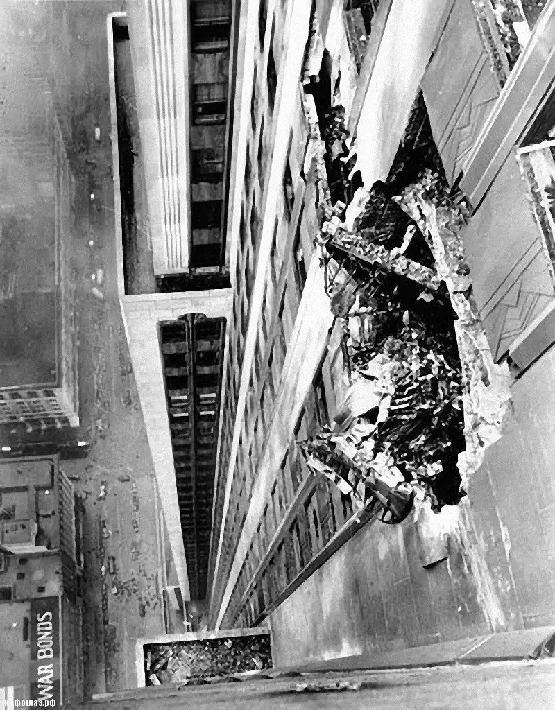 Повреждения небоскрёба Эмпайр Стейт Билдинг после столкновения с самолётом