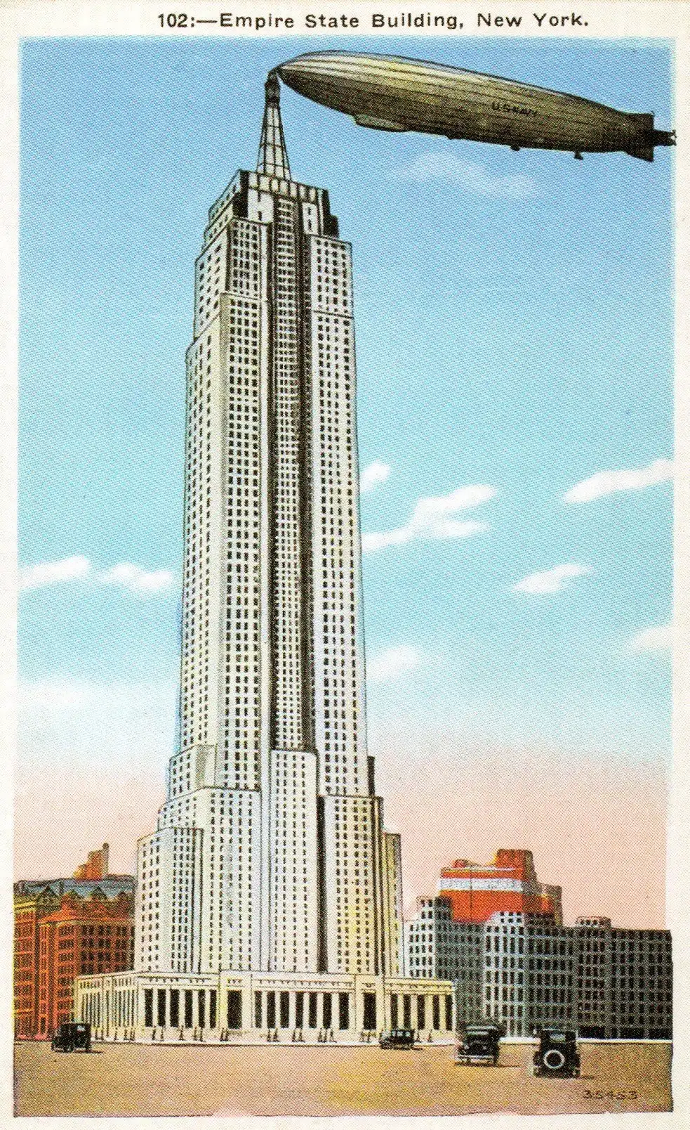 Шпиль небоскреба, выполненный в стиле Арт Деко, изначально был спроектирован как причальная мачта и место стоянки для дирижаблей. Сто второй этаж сначала был посадочной площадкой, на нем располагался специальный трап. Отдельный лифт между 86 и 102 этажами должен был поднимать пассажиров наверх после того, как они отметятся на смотровой площадке на 86 этаже. Однако, после нескольких попыток подвести к небоскребу дирижабль оказалось, что это сложно и опасно из-за сильных восходящих потоков воздуха, возникающих из-за огромной высоты здания. В 1952 году к шпилю небоскреба была прикреплена большая телевизионная вышка.